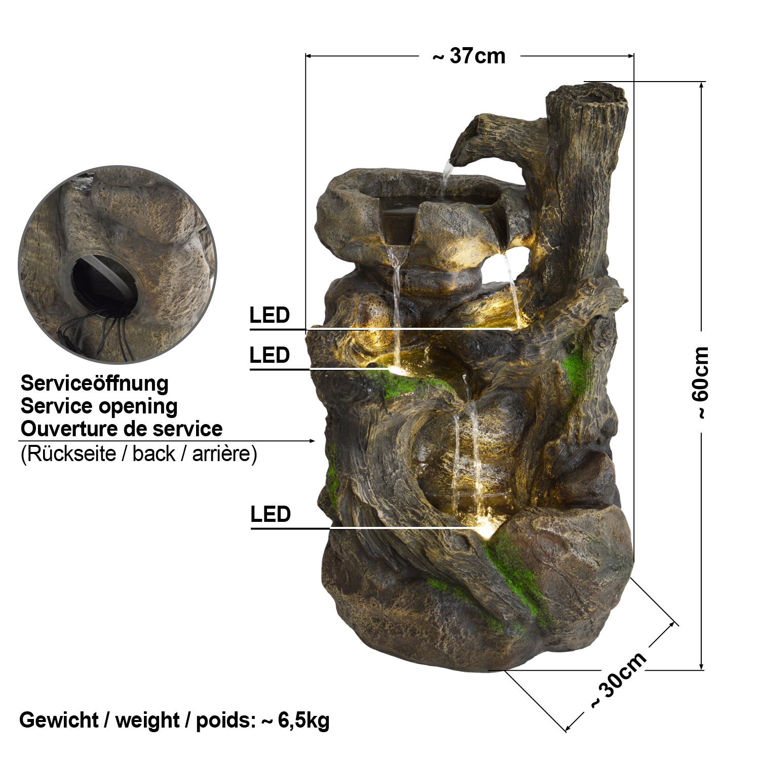 ist für den Innen- und Außenbereich geeignet. Der sorgt für eine tolle Atmosphäre und Entspannung, wertet jede Umgebung und belebt Wohnzimmer, Esszimmer, Flure und Eingangsbereiche, Wintergärten oder Balkone, Terrassen und Gärten im privaten wie gewerblichen Umfeld. Fließendes Wasser wirkt sich positiv auf die Stimmung aus und liefert ein angenehmes Mikroklima an heißen Sommertagen. Die naturgetreue Optik und die weiße LED-Beleuchtung machen den Brunnen Tag und Nacht zum perfekten Blickfang.