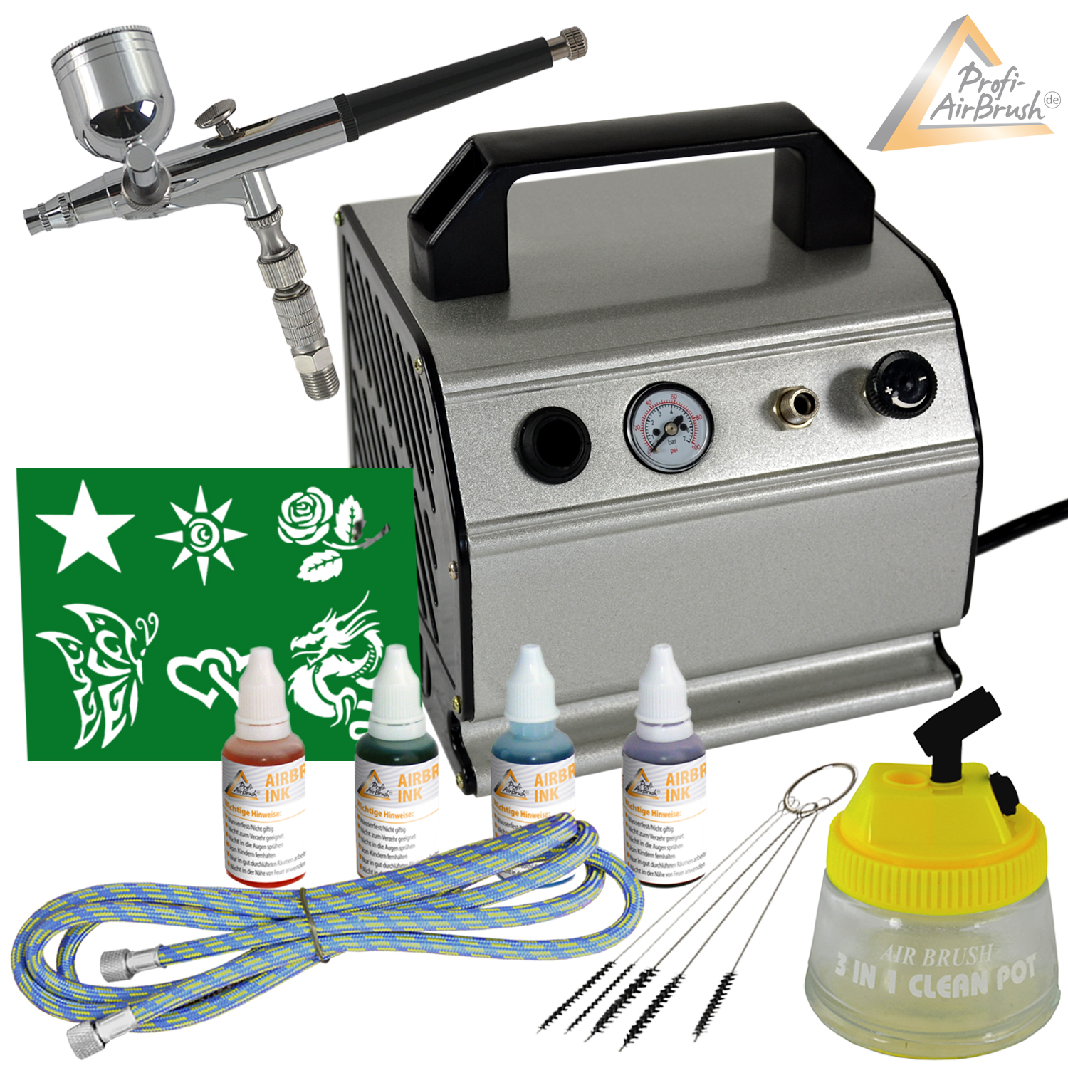 Sie erhalten außerdem 4 trendige Airbrush-Tattoo-Farben sowie 6 Tattoo-Schablonen für die einfache und schnelle Erstellung von professionellen Airbrush-Tattoos – lassen Sie Ihrer Kreativität freien Lauf!