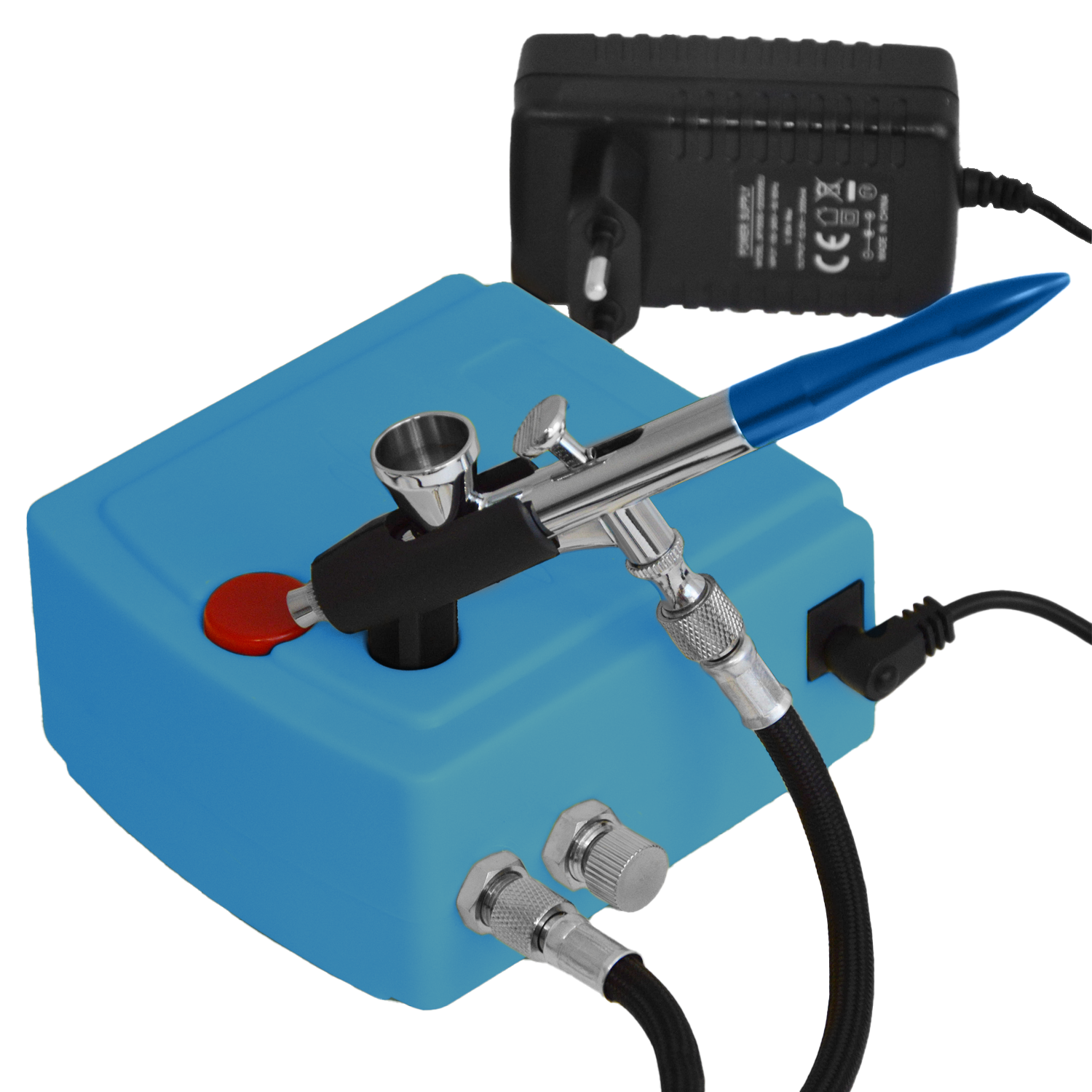 Ce système sans huile et sans entretien Airbrush Kompressor Set Carry I ist Mini-Airbrush-Kompressor mit Autostop-Funktion und einem integrierten 360°-Airbrushpistolen-Halter. Der Airbrushkompressor ist für Arbeiten mit allen handelsüblichen Airbrush Farben geeignet. Mit nur 47dB ermöglicht er angenehmes Arbeiten auch in kleineren, geschlossenen Räumen. Dieser kompakte Kompressor ist perfekt geeignet um kleinere Arbeiten auch unterwegs zu erledigen. Die Anwendungsgebiete gehen über Nagel Design, Lebensmittel wie Torten, Blumen und Gestecke, bis zu feinen Modellbau Projekten.