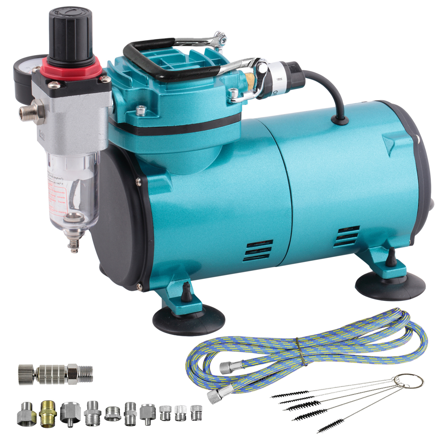 Der Airbrush-Kompressor ist mit einer Top-Technik ausgestattet: Es handelt sich um einen energieeffizienten Einzel-Zylinder-Kolbenkompressor für Airbrush mit integriertem Durchfluss- und Druckregler, Manometer und Wasserabschneider.