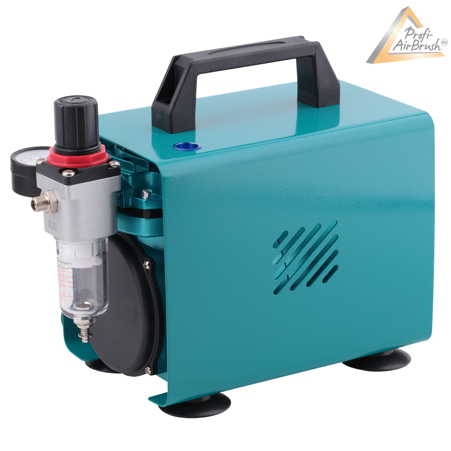 Es handelt sich um einen energieeffizienten Einzel-Zylinder-Kolben-Kompressor für Airbrush. Er hat einen integrierten Manometer, einen integrierten Luftfilter, einen integrierten Wasserabschneider sowie einen integrierten Druck- und Durchflussregler.