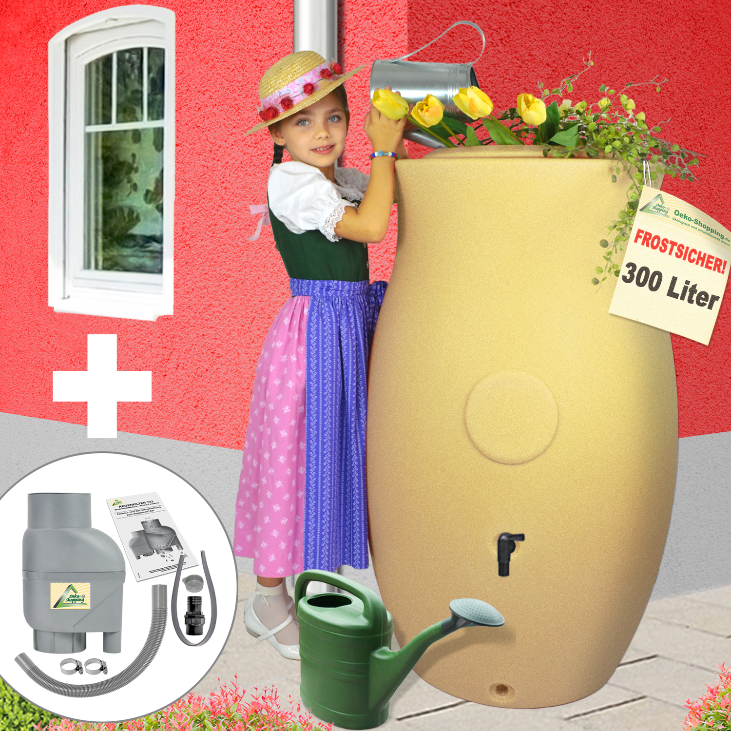 Regenfass mit Pflanzschale – Amphore Maja 300l beige-gelb – zzgl. Fallrohrfilter T33 – Auswahl