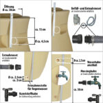 Zum Zubehör der Regentonne gehören ein passender Deckel sowie ein Auslaufhahn aus PE-Kunststoff in schwarz. Der Deckel der hochwertigen Regentonne ist mit einer integrierten Pflanzschale ausgestattet. Mit der intergrierten Pflanzschale können Sie die in zwei Farben (terra-kotta, beige-gelb) und zwei Größen (300l, 500l) erhältliche Regentonne individuell gestalten. Der Auslaufhahn für Regentonnen hat einen 3/4-Zoll-Anschluss. Er kann optimal an den dezent vorgeformten Stellen am Regenfass für den Wasser-Zu- und Ablauf angebracht werden. Zur hochwertigen Regentonne erhalten Sie außerdem einen Füllstandschlauch inklusive Befestigungsmaterial.