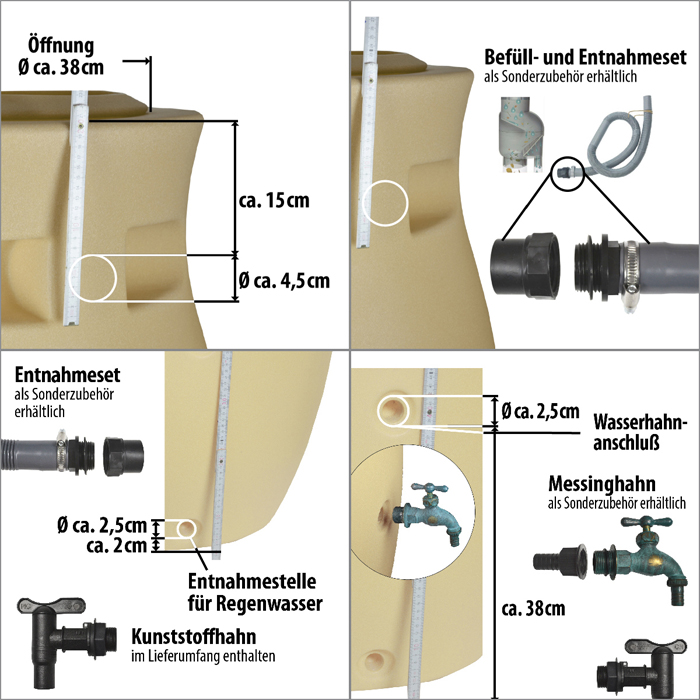 • 1,9cm (3/4 Zoll) für einen Wasserhahn befindet sich ca. 40cm über dem Tonnenboden