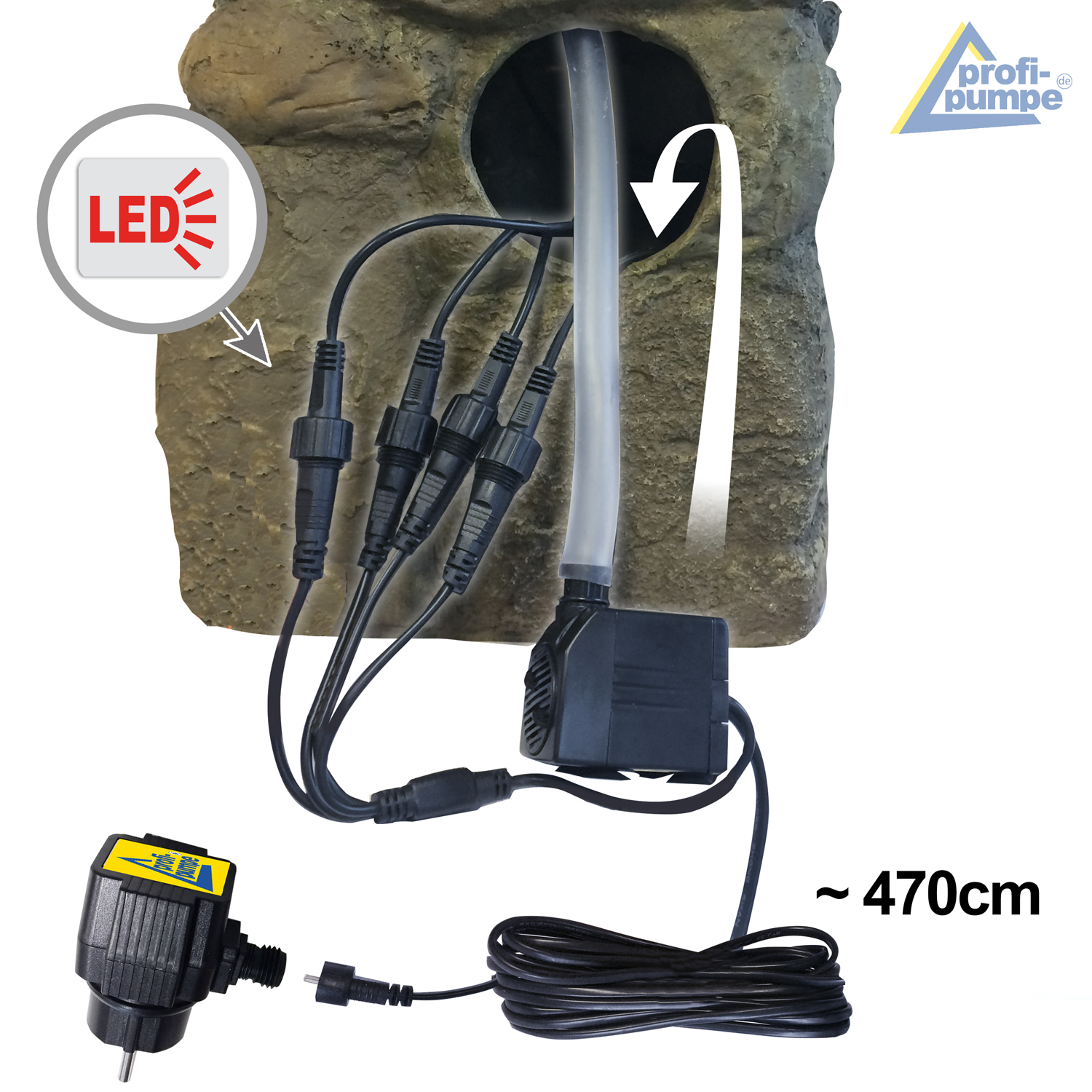 Gartenbrunnen FELS-ZAUBER mit LED-Ring (4×1 warm weiß) und 230/12V-Netzadapter. Für den Innen- und Außenbereich.