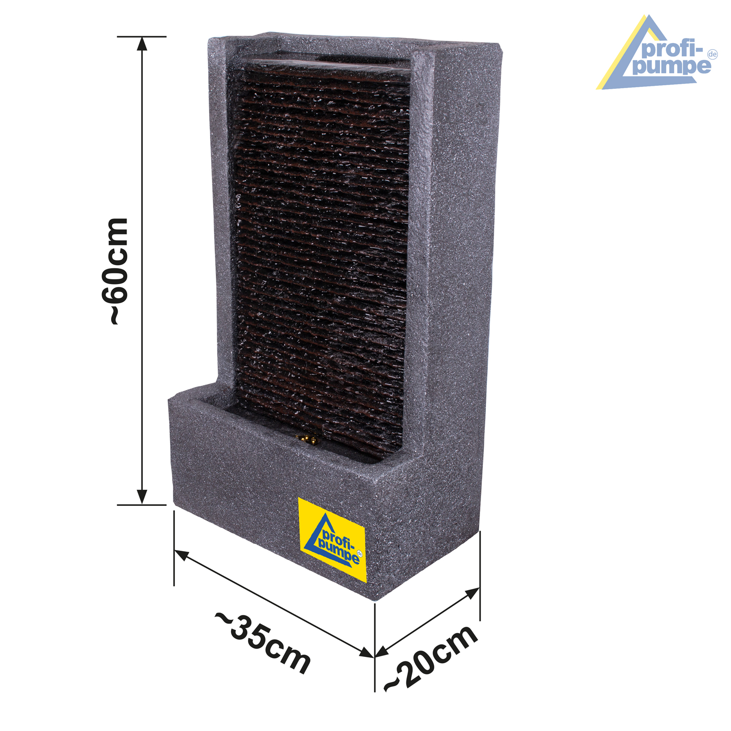 Fließendes Wasser wirkt sich positiv auf die Stimmung aus und liefert ein angenehmes Mikroklima an heißen Sommertagen. Die naturgetreue Optik und die weiße LED-Beleuchtung machen den Brunnen Tag und Nacht zum perfekten Blickfang.
