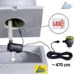 Der moderne Zierbrunnen ist für den 230-Volt-Betrieb vorgesehen. Die Pumpe und die LEDs werden mit sicherer 12V-Niederspannung betrieben (Adapter im Lieferumfang enthalten). Alle Kabelverbindungen sind verpolungssicher, wasserdicht und absolut funktionssicher. Dank praktischer Steckverbindungen sind alle Komponenten jederzeit austauschbar. So können Sie den formschönen Wasserbrunnen und das beruhigende, fließende Wasser jahrelang genießen!