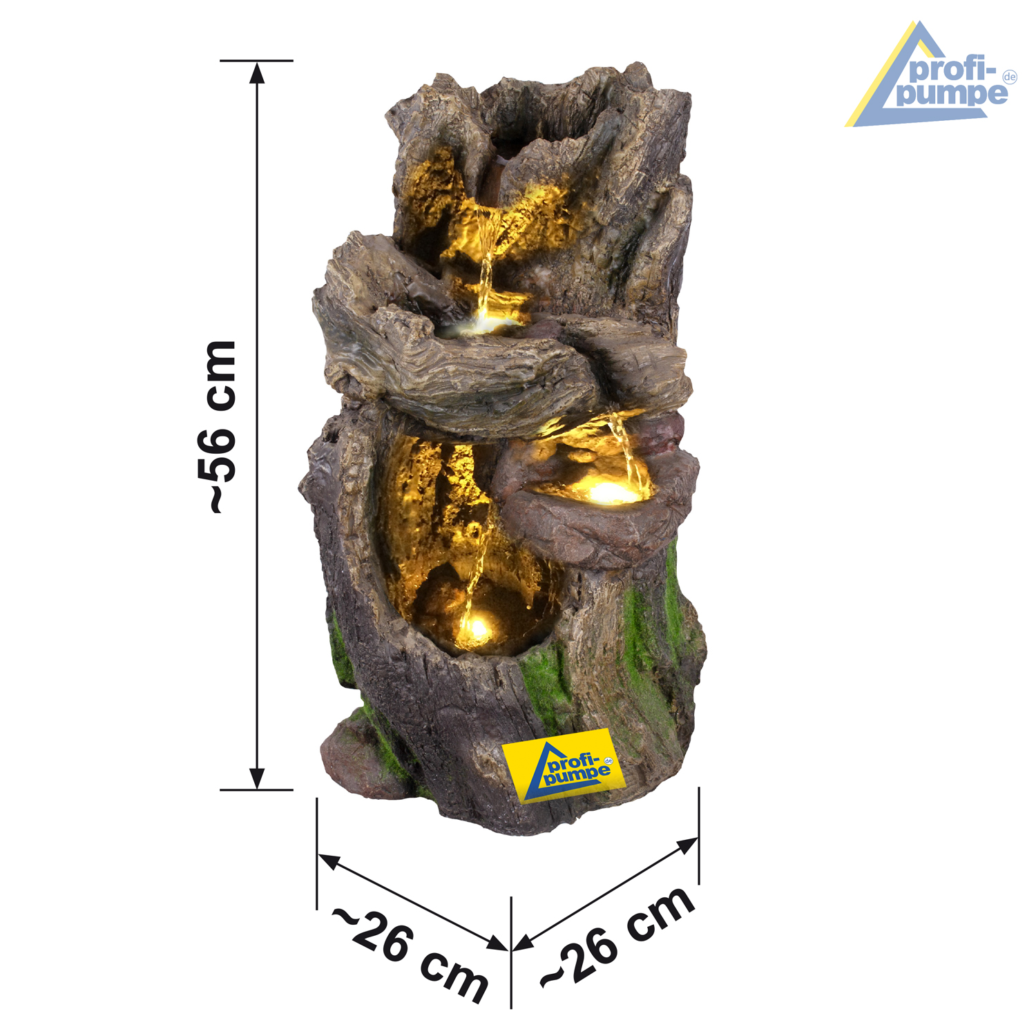 Der Brunnen “WALD-BÄCHLEIN” mit 3 austauschbaren LED-Lichtern (3*1) ist für den Innen- und Außenbereich geeignet. Betrieben wird der stilvolle Wasserbrunnen mit einem 230/12-Volt Netzadapter. Mit der wirklichkeitsgetreuen Holz-Optik sorgt der moderne Gartenbrunnen für eine harmonische Atmosphäre und Entspannung. Das Lebenselixier Wasser belebt Wohnzimmer, Esszimmer, Flure und Eingangsbereiche, Wintergärten oder Balkone, Terrassen und Gärten im privaten wie gewerblichen Umfeld.