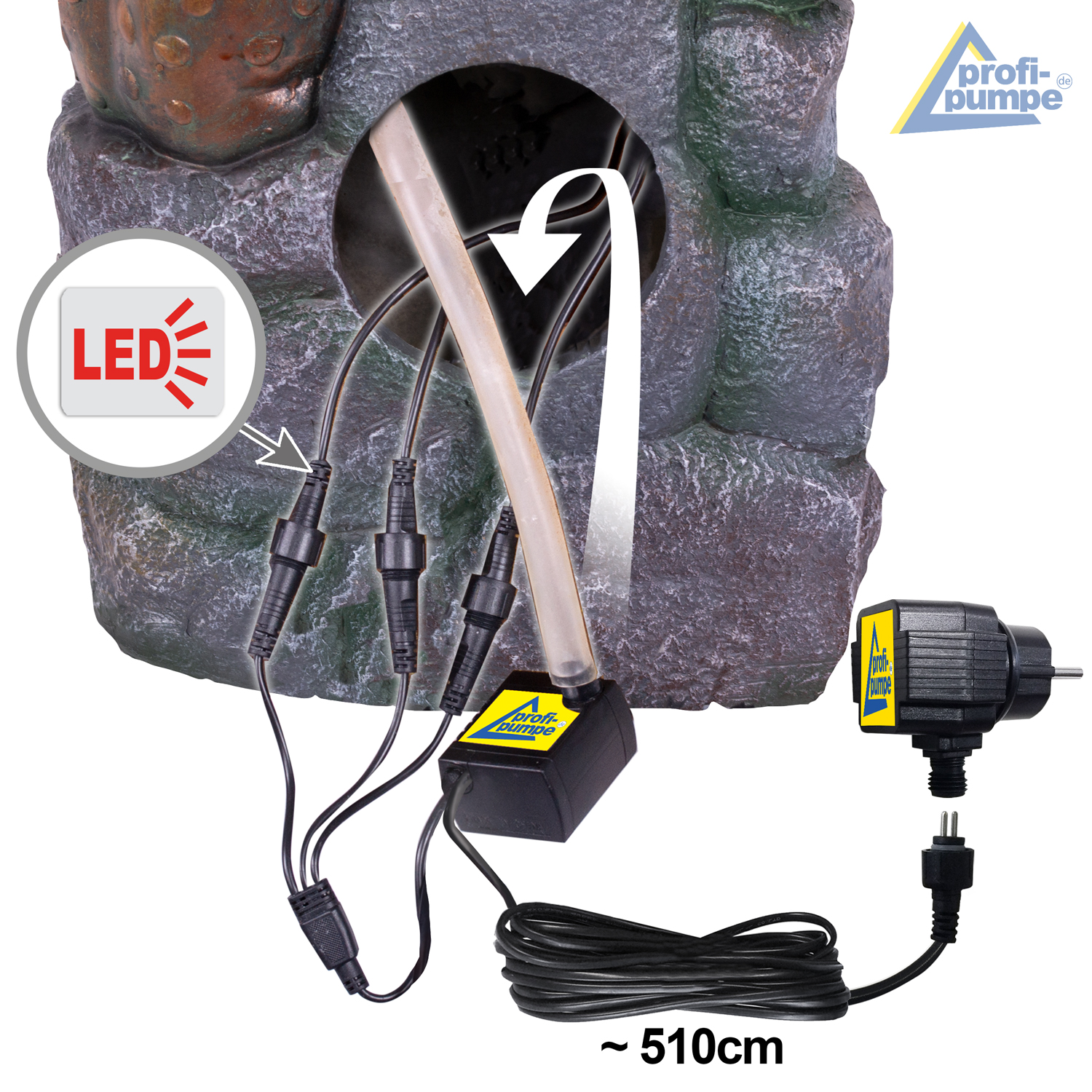Der Wasserbrunnen ist für den 230-Volt-Betrieb vorgesehen. Die Pumpe und die LEDs werden mit sicherer 12V-Niederspannung betrieben (Adapter im Lieferumfang enthalten). Alle Kabelverbindungen sind verpolungssicher, wasserdicht und absolut funktionssicher. Dank praktischer Steckverbindungen sind alle Komponenten jederzeit austauschbar. So können Sie den Wasserbrunnen mit der effektvollen LED-Beleuchtung und das fließende Wasser jahrelang genießen!