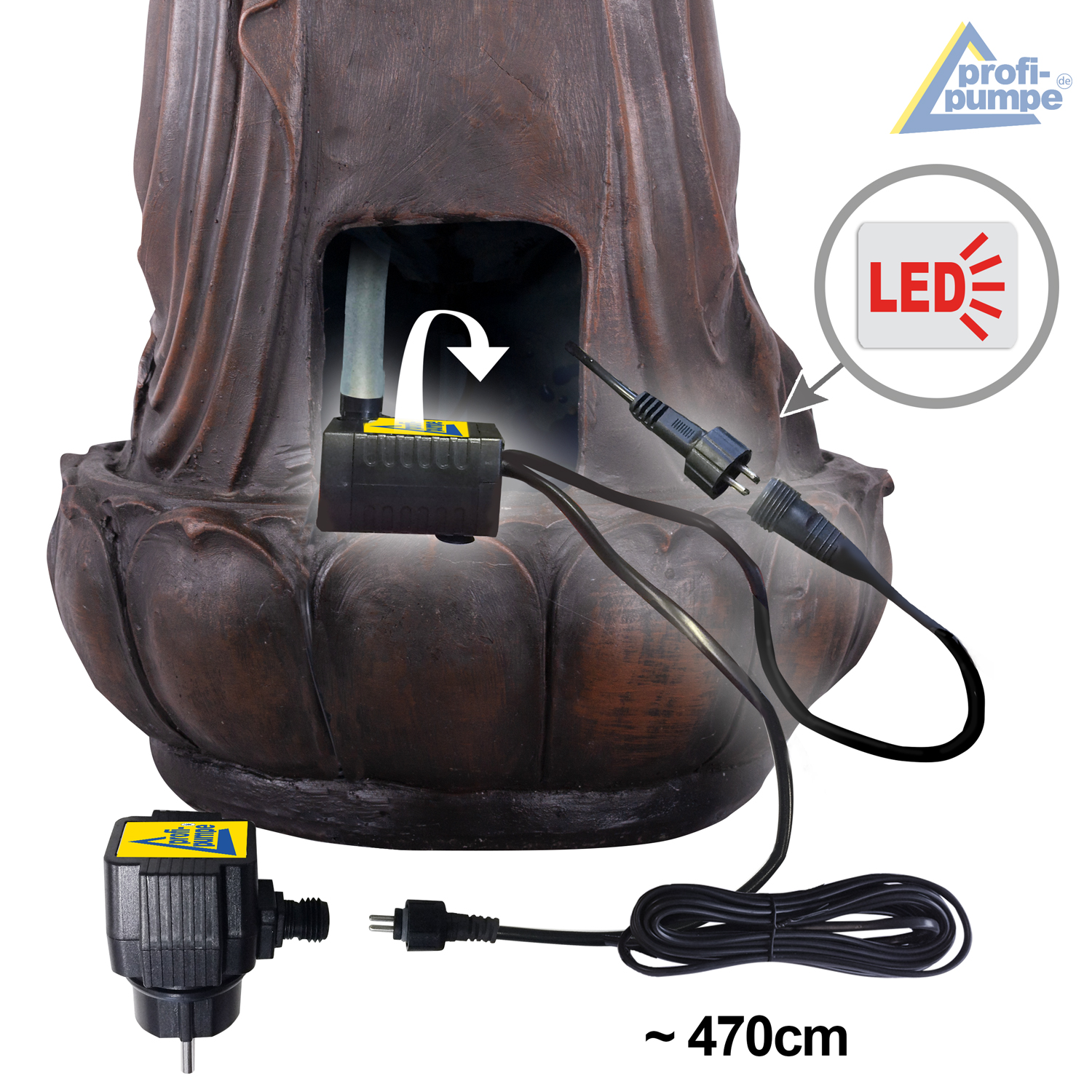 Der moderne Zierbrunnen mit LED-Beleuchtung ist für den 230-Volt-Betrieb vorgesehen. Die Pumpe und die LEDs werden mit sicherer 12V-Niederspannung betrieben (Adapter im Lieferumfang enthalten). Alle Kabelverbindungen sind verpolungssicher, wasserdicht und absolut funktionssicher. Dank praktischer Steckverbindungen sind alle Komponenten jederzeit austauschbar. So können Sie den Wasserbrunnen ZHEN KRAFT-QUELLE und das fließende Wasser jahrelang genießen!
