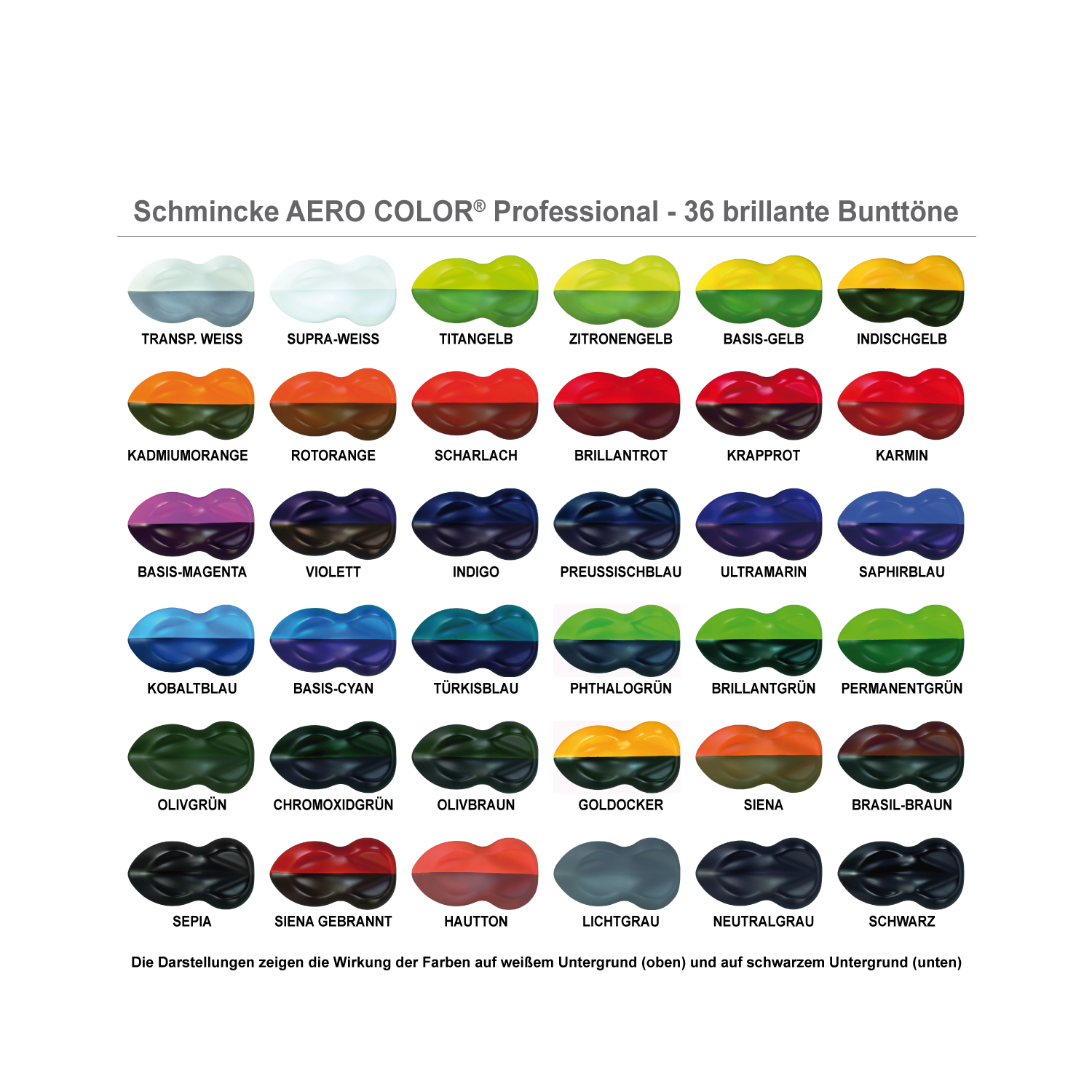 Das Airbrushkonzept aus dem Hause Schmincke umfasst ein coloristisch harmonisches Farbsortiment aus 36 brillanten Farbtönen, 24 außergewöhnlichen Effektfarben sowie vielen Hilfsmitteln, die von der Grundierung bis zur Schlussbehandlung das gesamte Anwendungsspektrum abdecken.
