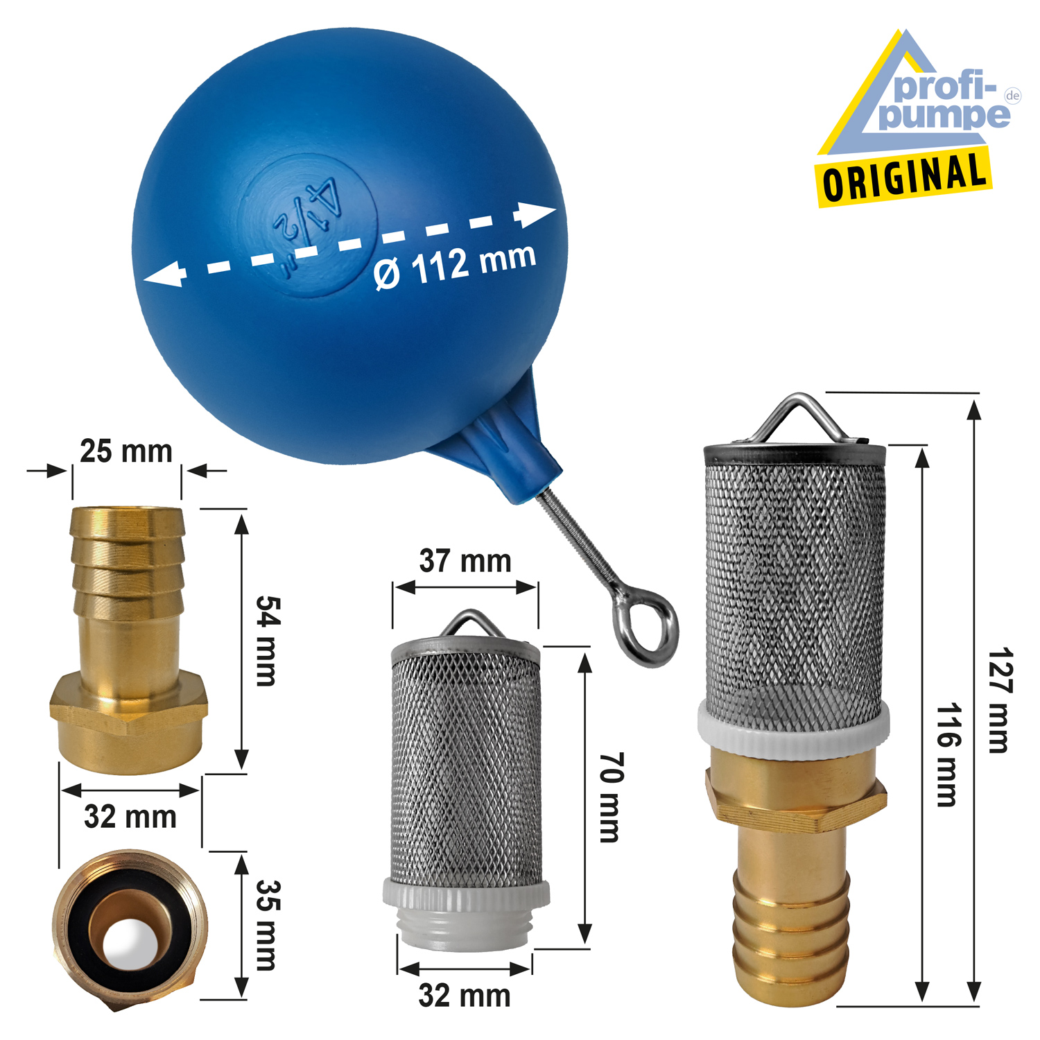 Das Ansaug-Set Ansaugset 7 für TOP MULTI 2 / EVO besteht aus einem Ansaugkorb aus rostfreiem Edelstahl, einer Schwimmerkugel, einem knickstabilen Saugschlauch sowie Anschlusstüllen.