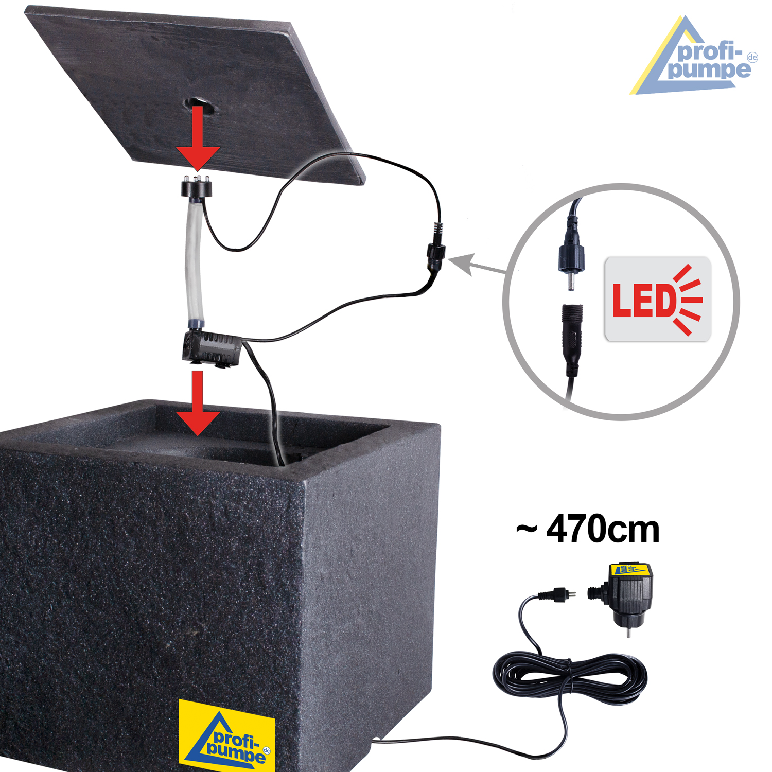 Der moderne Zierbrunnen mit LED-Beleuchtung ist für den 230-Volt-Betrieb vorgesehen. Die Pumpe und die LEDs werden mit sicherer 12V-Niederspannung betrieben (Adapter im Lieferumfang enthalten). Alle Kabelverbindungen sind verpolungssicher, wasserdicht und absolut funktionssicher. Dank praktischer Steckverbindungen sind alle Komponenten jederzeit austauschbar. So können Sie den Wasserbrunnen BASALT-MODERNA und das fließende Wasser jahrelang genießen!