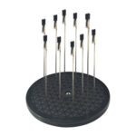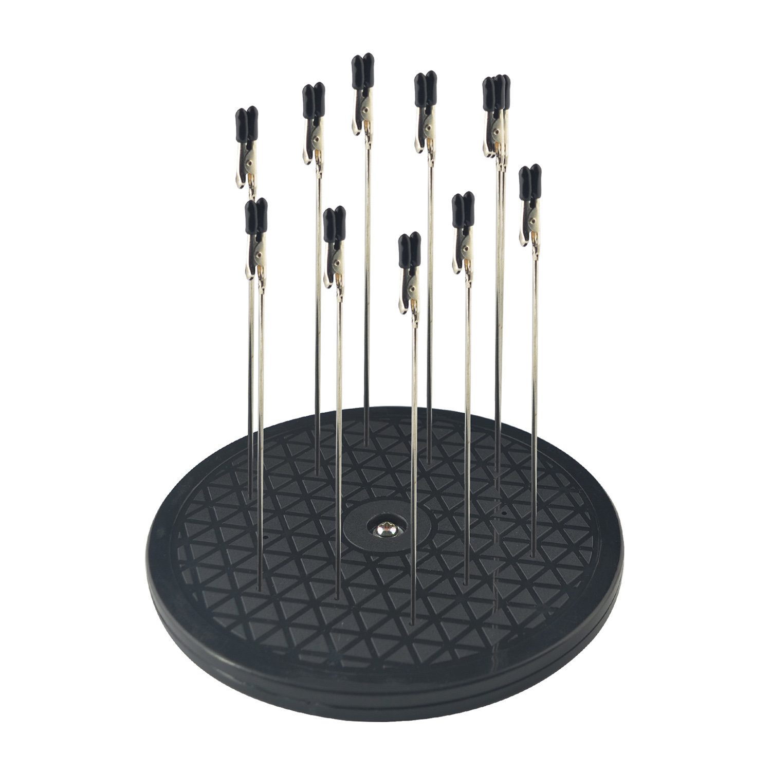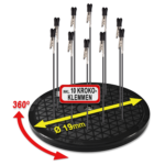 Kleinere Modellteile und Objekte können mit Hilfe der mitgelieferten Krokodilklemmen befestigt werden. Die Klemmen lassen sich, für einen sicheren Halt, mit ihrer Eisenstange in dafür vorgesehene Bohrungen im Drehteller stecken.