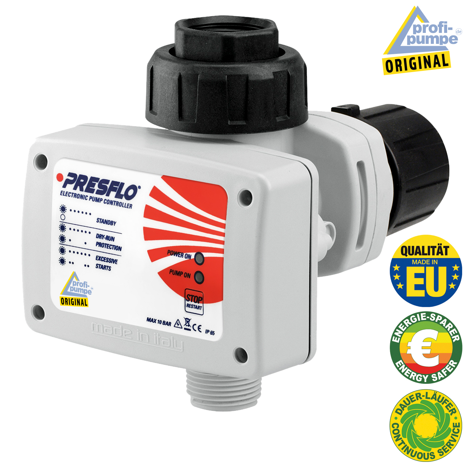 Das Besondere an dieser Pumpensteuerung PRESFLO-2-VARIO® mit integriertem Trockenlaufschutz und intelligenter Selbst-Überwachungsfunktion mit Pumpenschutz ist, dass der Einschaltdruck je nach Bedarf von (Pm): 0,8 ‹–› 2,4 bar (12 à 35 psi) eingestellt werden kann. Die Geräte-Software überwacht die Einschaltintervalle. Bei zu häufigen “Ein-” und “Ausschaltvorgängen” in regelmäßigen Abständen wird die Pumpe nach einer fest eingestellten Zeit für eine bestimmte Pausenzeit ausgeschaltet. Nach Ablauf der Pausenzeit wird die Pumpe eingeschaltet und die Schaltvorgänge beobachtet und ausgewertet. Für viele Pumpenanwendungen ist es wichtig, daß wenn eine Störung in der Pumpe vorkommt (warum auch immer, z.b. durch Schmutzeintritt!, was manchmal unvermeidlich ist!), daß die Pumpe nicht taktet, sondern sich sicher VORHER abschaltet. Genau das macht diese hochwertige Pumpensteuerung aus europäischer Herstellung.