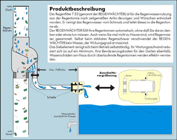 Der Regenfilter T33 wird in das Fallrohr der Regenrinne eingebaut. Dort filtert er Blätter, Insekten, Sandkörner und andere Partikel aus dem Regenwasser. So wird die Regentonne stets mit sauberem Wasser befüllt.