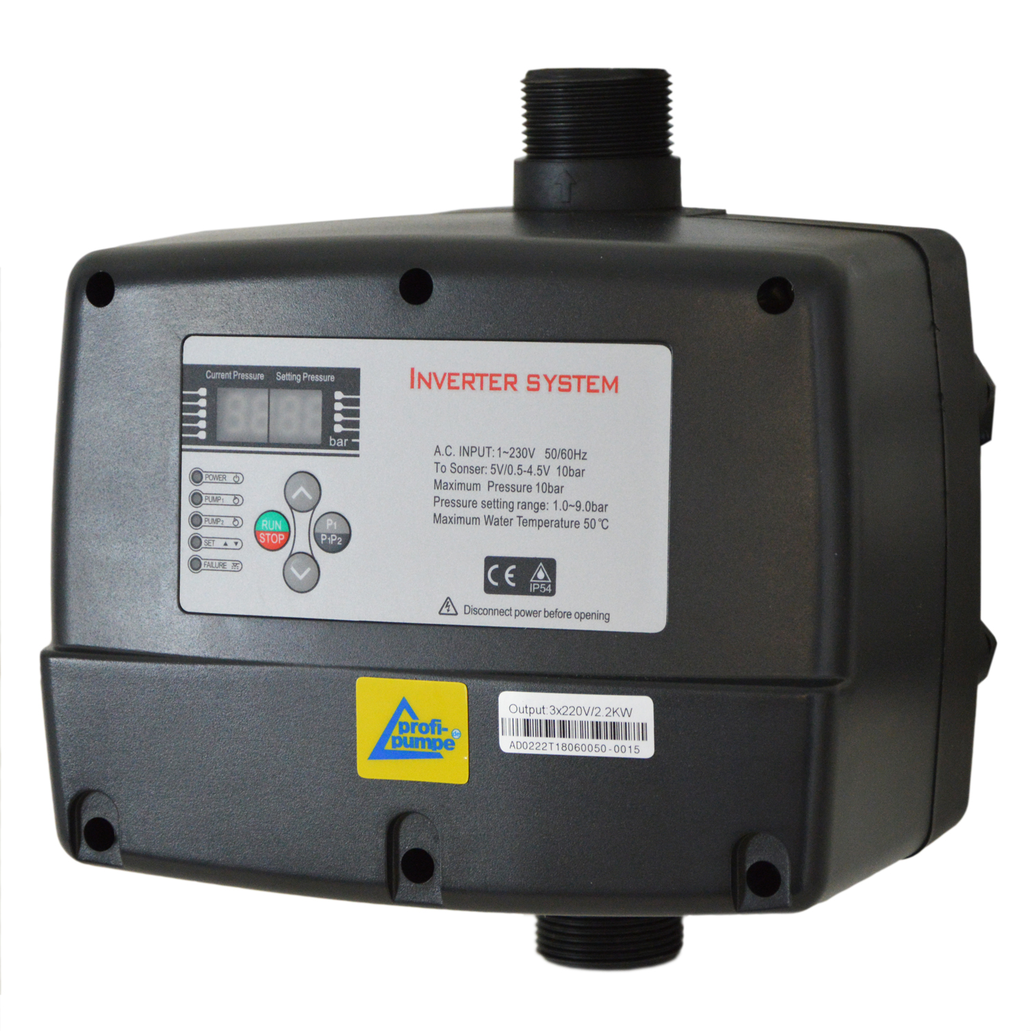Il INVERTER-Pumpensteuerung 3-1,5KW 1*230V, verkabelt (IPC-3-VK) ist ein variabler Frequenz-Controller für einphasige 230-Volt-Pumpen bis max. 1500 Watt Nenn-Leistung, basierend auf der innovativen in der Industrie bewährten Technologie.
