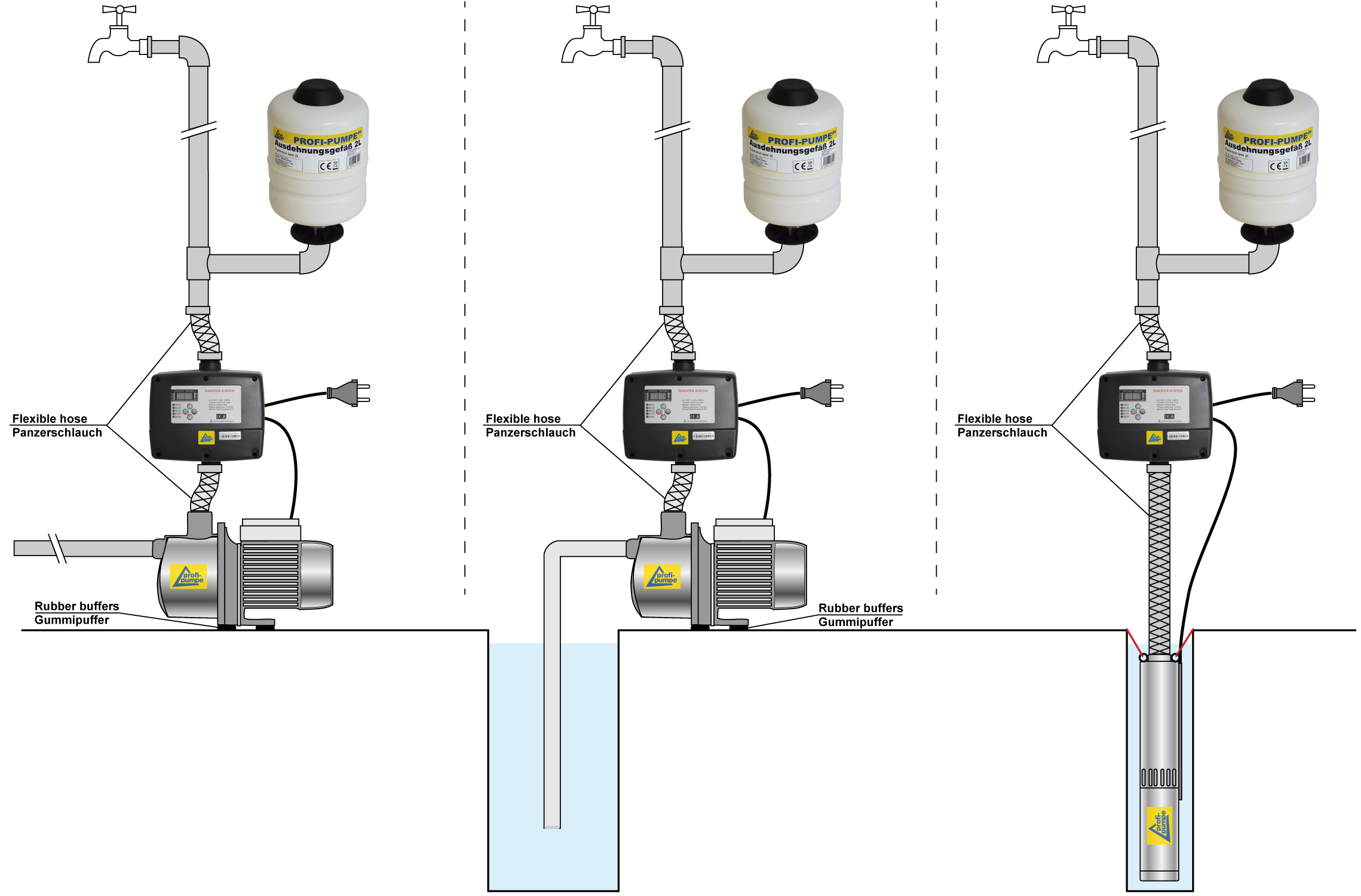 - Zuverlässiger integrierter Trockenlaufschutz mit einstellbarem Auto-Start