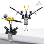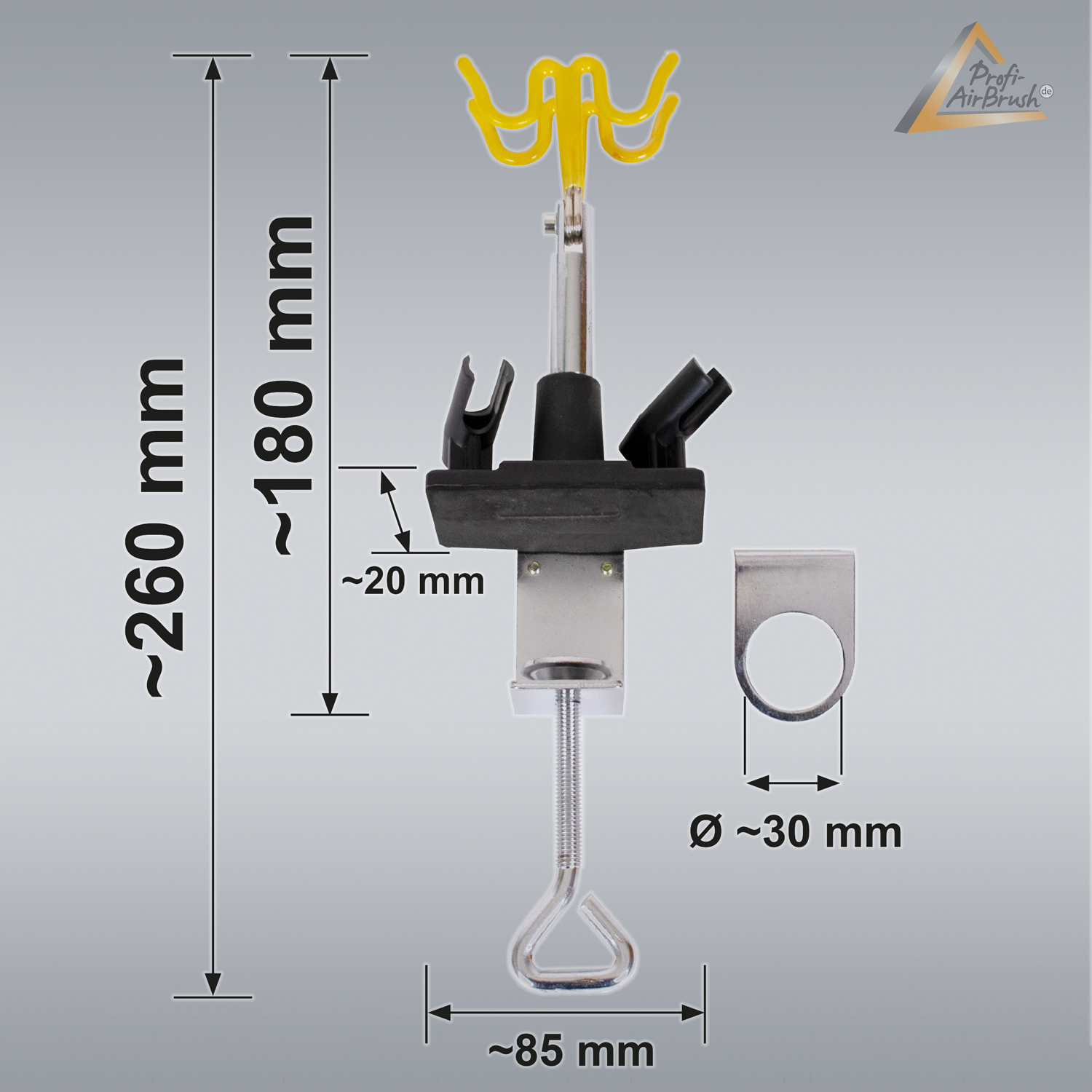 Der Airbrush Halter „Profi- AirBrush Holder H3“ dient der sicheren Aufbewahrung der Sprühpistolen, ohne dass Farbe ausläuft oder sie einfach beim Ablegen umfallen. Bis zu 4 Geräte finden auf dem Halter Platz. Der „Profi- AirBrush Holder H3“ wird fest an einer Tischplatte anmontiert. Geeignet auch für die meisten Werkbänke.