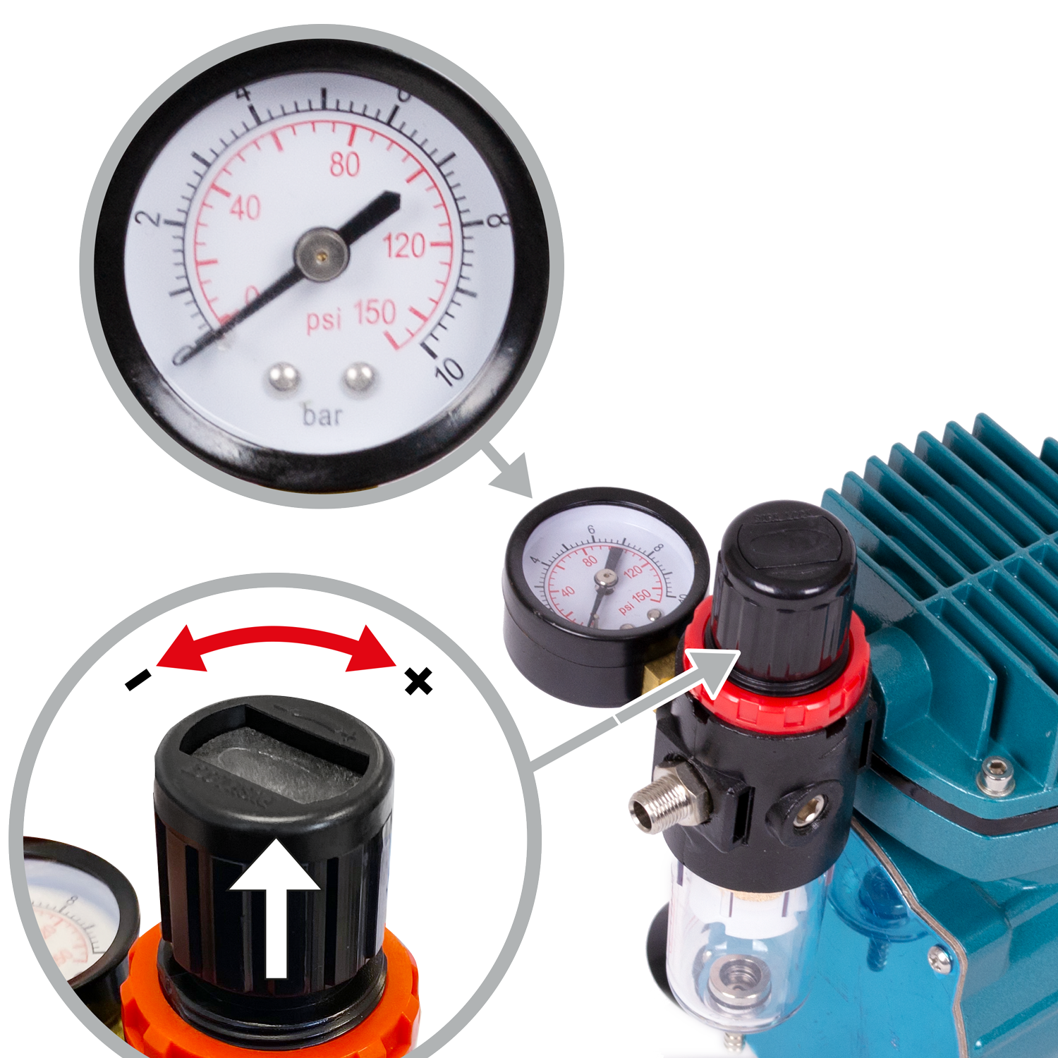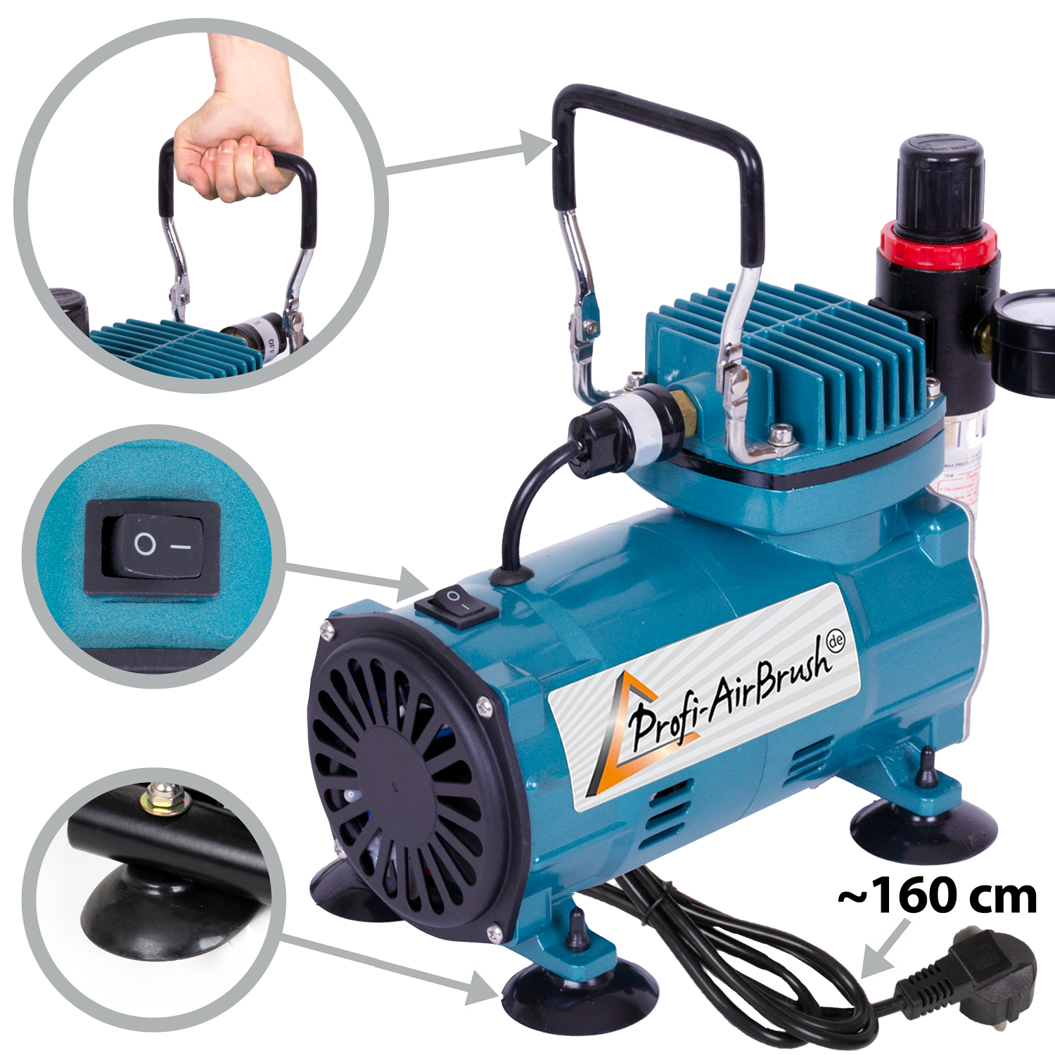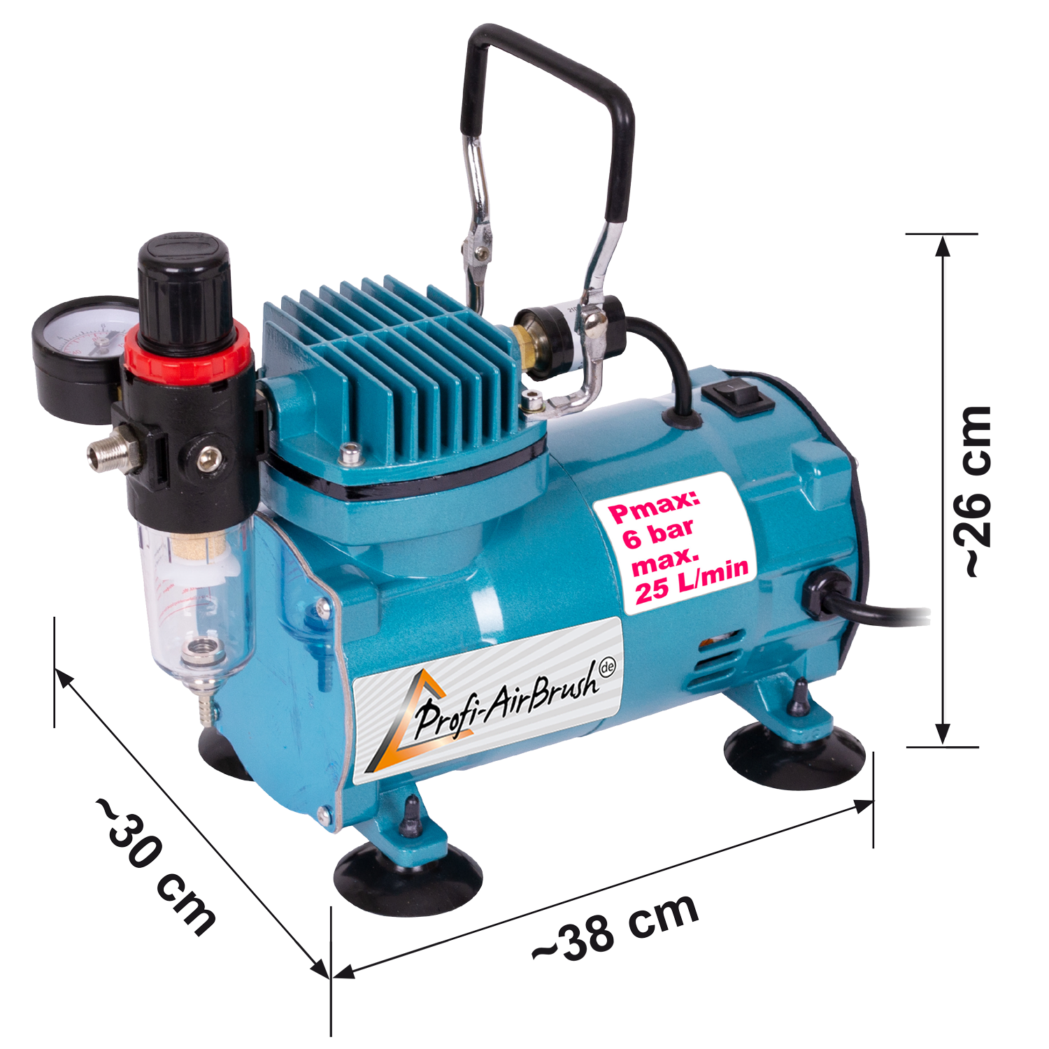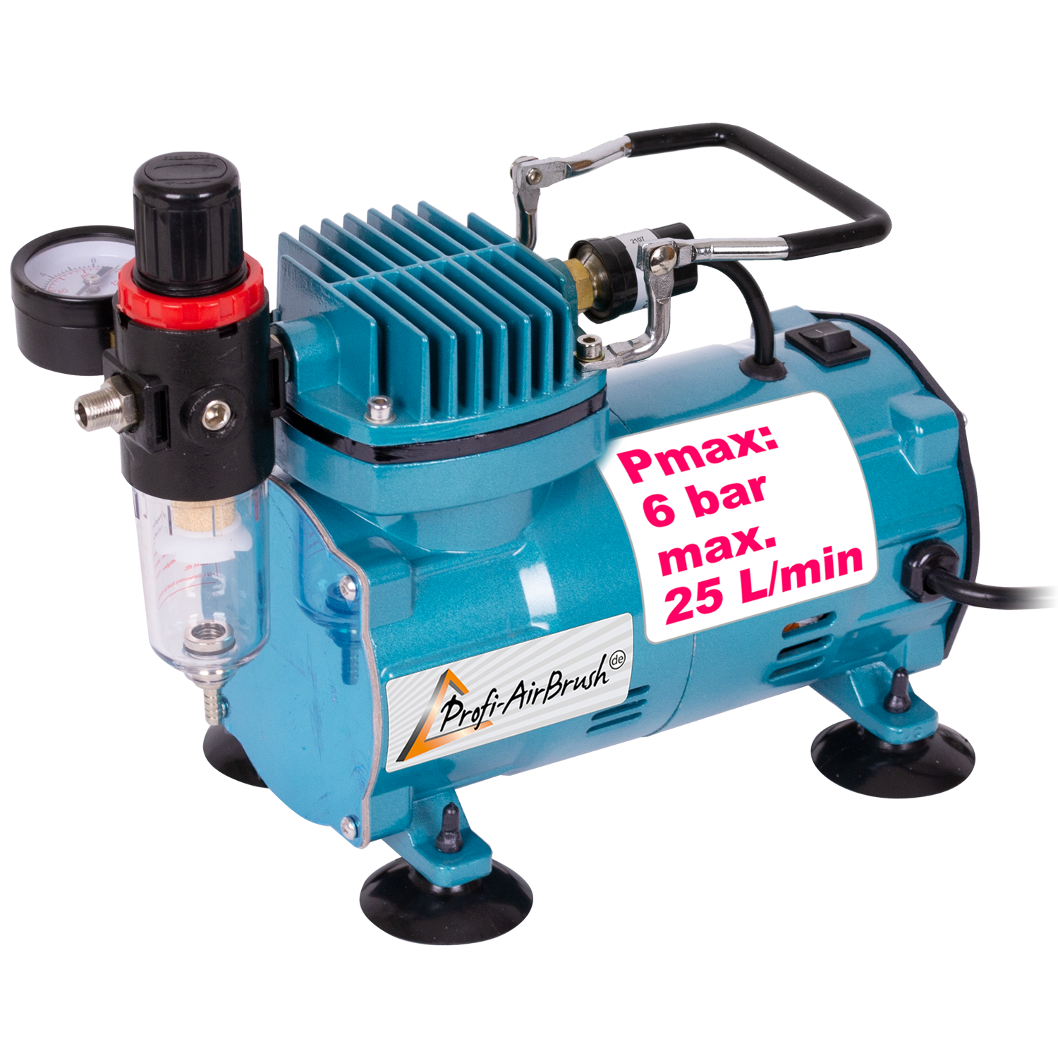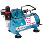 Der Airbrush-Kompressor ist mit einer Top-Technik ausgestattet: Es handelt sich um einen energieeffizienten Einzel-Zylinder-Kolbenkompressor für Airbrush. Integriert sind folgende Komponenten: Durchfluss- und Druckregler, Manometer und Wasserabschneider. Der Airbrushkompressor ist thermisch geschützt. Der maximale Arbeitsdruck des Airbrush-Kompressors beträgt 6,5 bar. Die maximale Luftabgabemenge pro Minute liegt bei 30 bis 35 Litern. Der Airbrush-Kompressor ist leicht zu bedienen und eignet sich für Anfänger und für Profis.