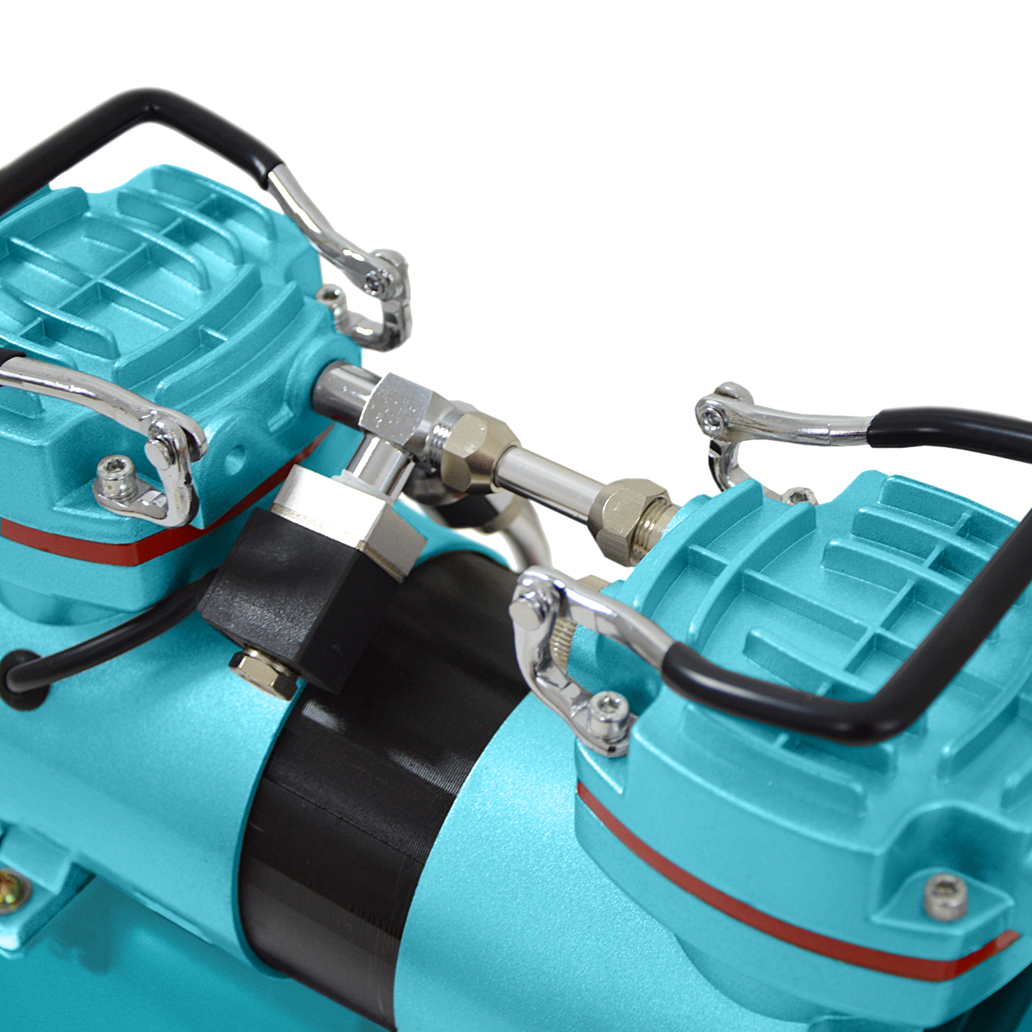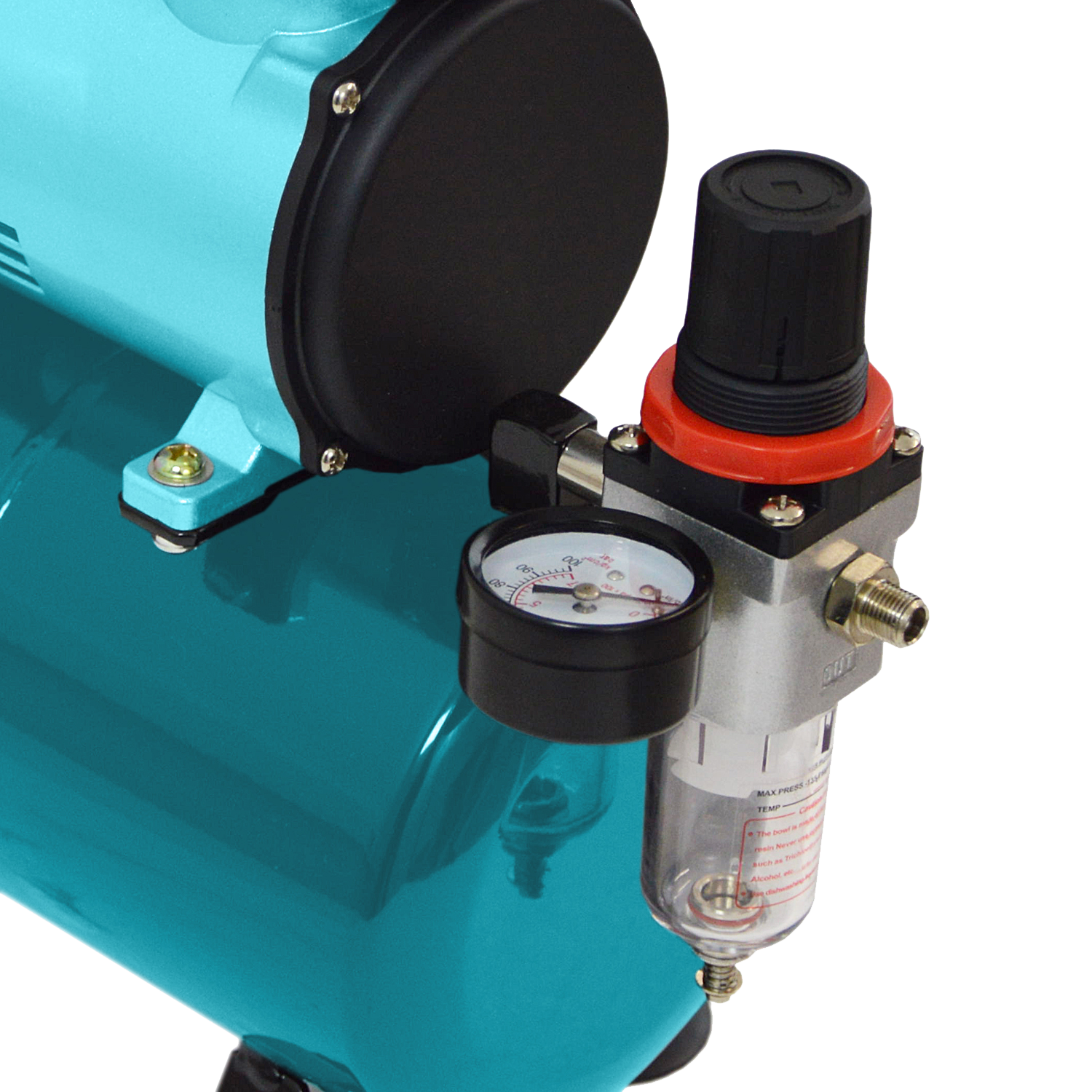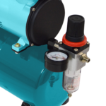 Ausgestattet ist der Airbrush Kompressor mit einem Tragegriff, einer Auto-Stop-Automatik, einem Manometer, einem Wasserabschneider, einem integrierten Durchfluss- und Druckregler und einem Luftdrucktank mit einer Druckluftreserve von 3,5 Litern.