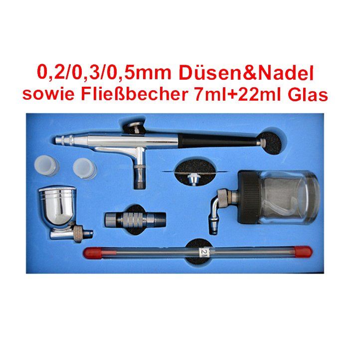 Die Airbrush-Pistole “Double-Action-Gun 134s” mit 0,2mm / 0,3mm / 0,5mm NADEL/DÜSE Kombination und 2 verschiedenen Farbbehältern (7ml und 22ml) ist besonders für den Beginner zum Kennenlernen der einzelnen Techniken und für ein zügiges Arbeiten optimal geeignet. Damit lassen sich sowohl feine Linien ziehen, als auch größere Flächen airbrushen. Für größere Farbmengen wird der 22ml-Glasbehälter und für kleinere Farbmengen der 7ccl Metallaufsatz verwendet. Mit der UNIVERSAL AIRBRUSH-PISTOLE DOUBLE-ACTION 134s macht das Hobby richtig Spaß!