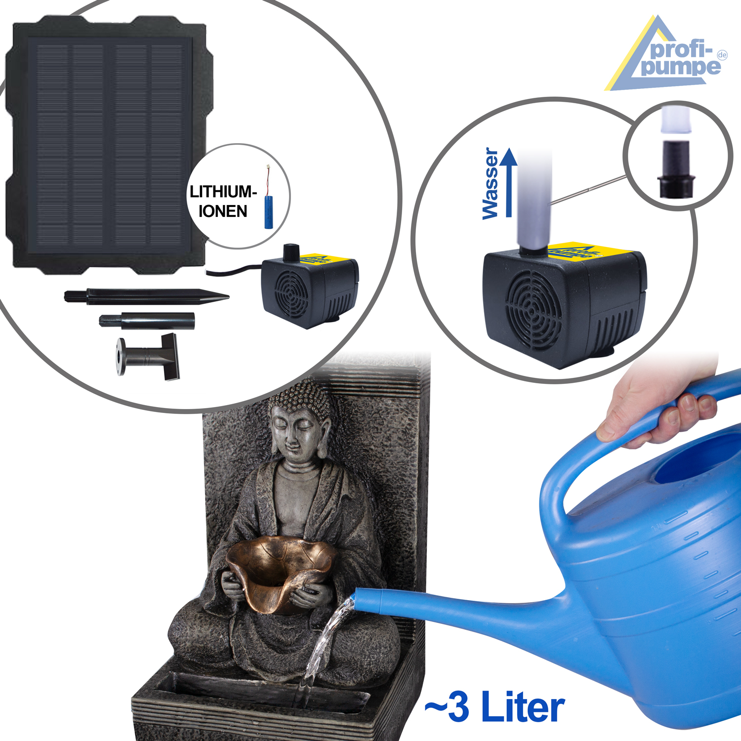 Solarbetriebener Garten-Brunnen mit Li-Ion Akku und LED-Lichter