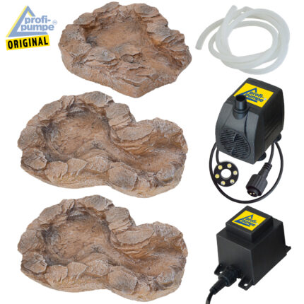 Zwei große Erweiterungs-Schalen und eine Schale mit Pumpenanschluss (oberste Schale) mit 4 RGB LED-Licht und 230-Volt-Anschluss
