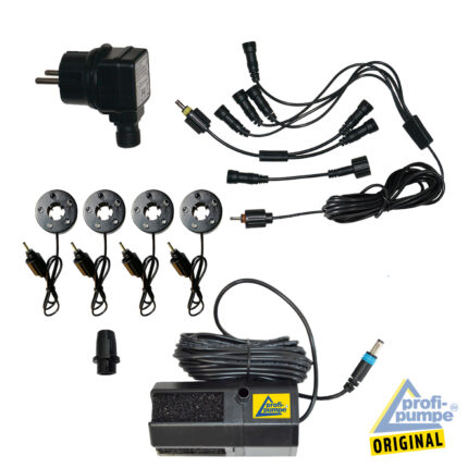 Teichpumpen-Set "OASIS 250-H"-Hybrid mit 230V-Anschluss, Solarbetrieb vorgesehen, 4Stck. 5-fach LED-RGB-Licht für Bachlauf QUELLBACH