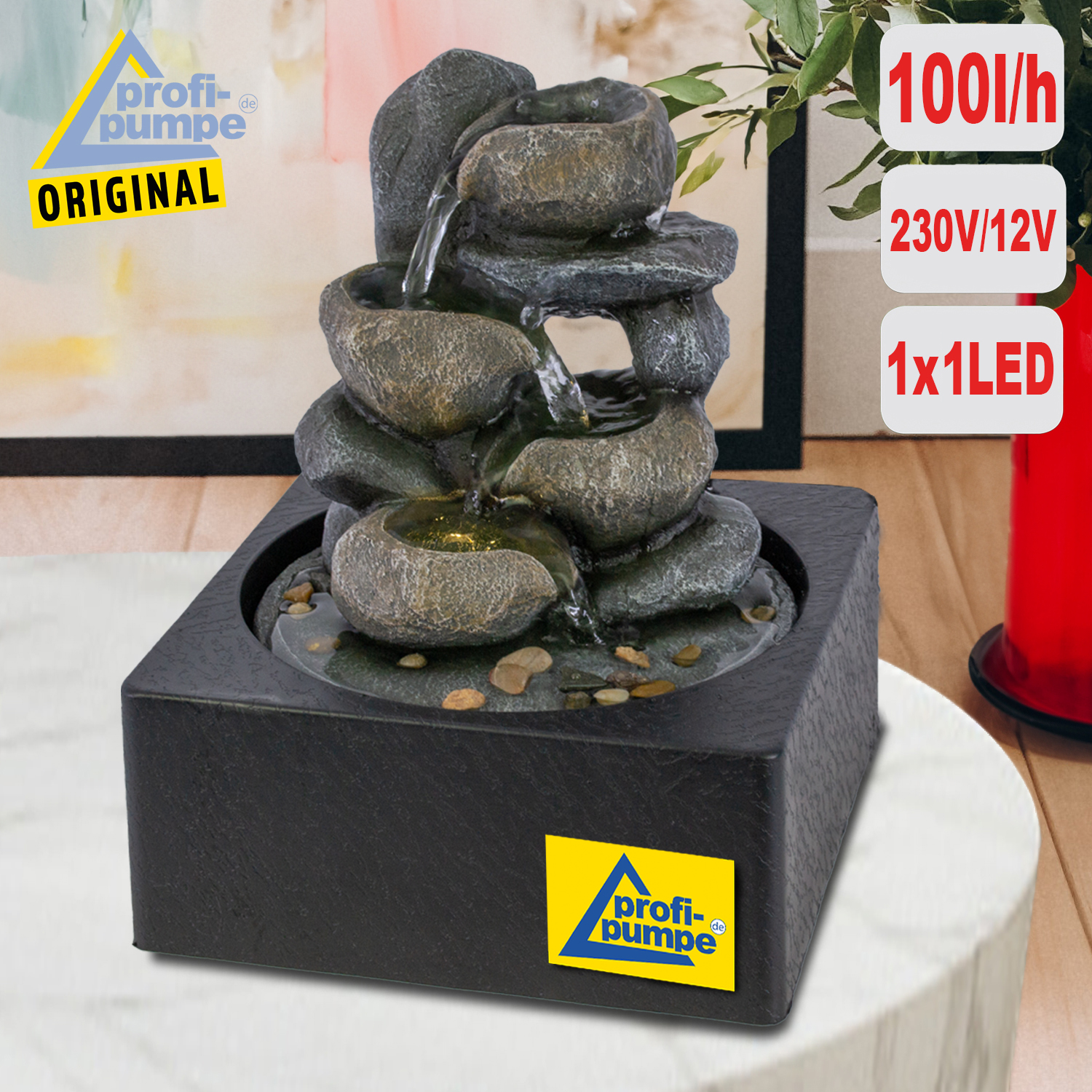 • LED-Zimmerbrunnen für den Innenbereich mit 230/12V-Netzadapter