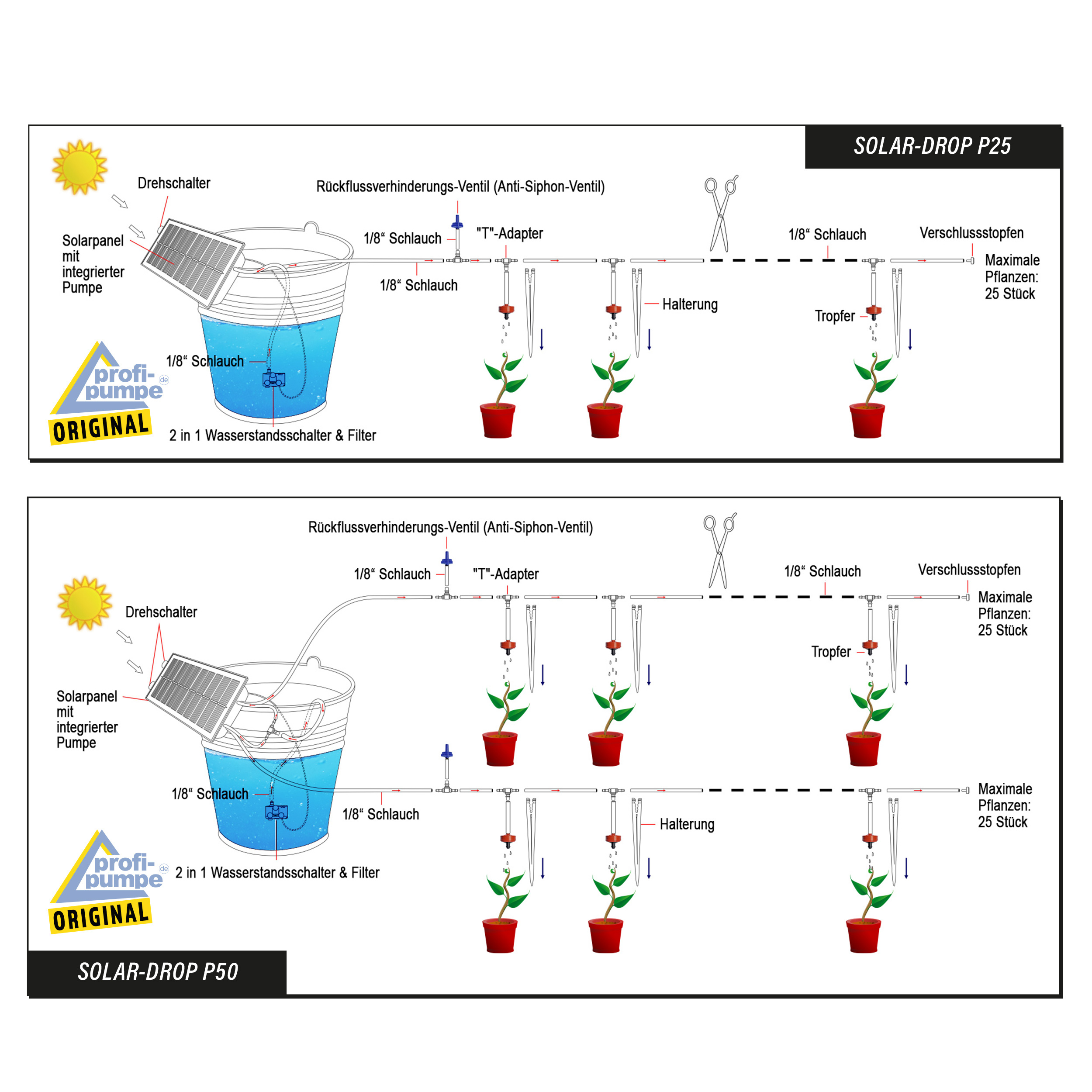 Mit dem Smart Controller SOLAR-DROP P50 erhalten Sie ein Komplett-Set, bestehend aus einer Steuereinheit, einer selbstansaugenden Solarpumpe mit Pumpenfilter, Anti-Syphon-Gerät, Wasserstandssensor, 15m Schlauch und allem Anschluss-Zubehör.