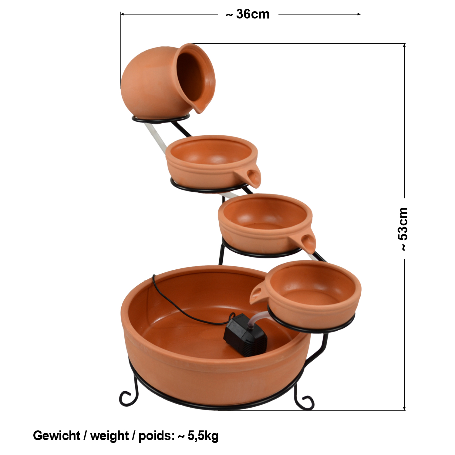 Bei Sonneneinstrahlung läuft das Wasser über die Tonschalen hinab. / Leistung 1,3 W / Höhe: ca. 55cm / Betrieb in direkter Sonne