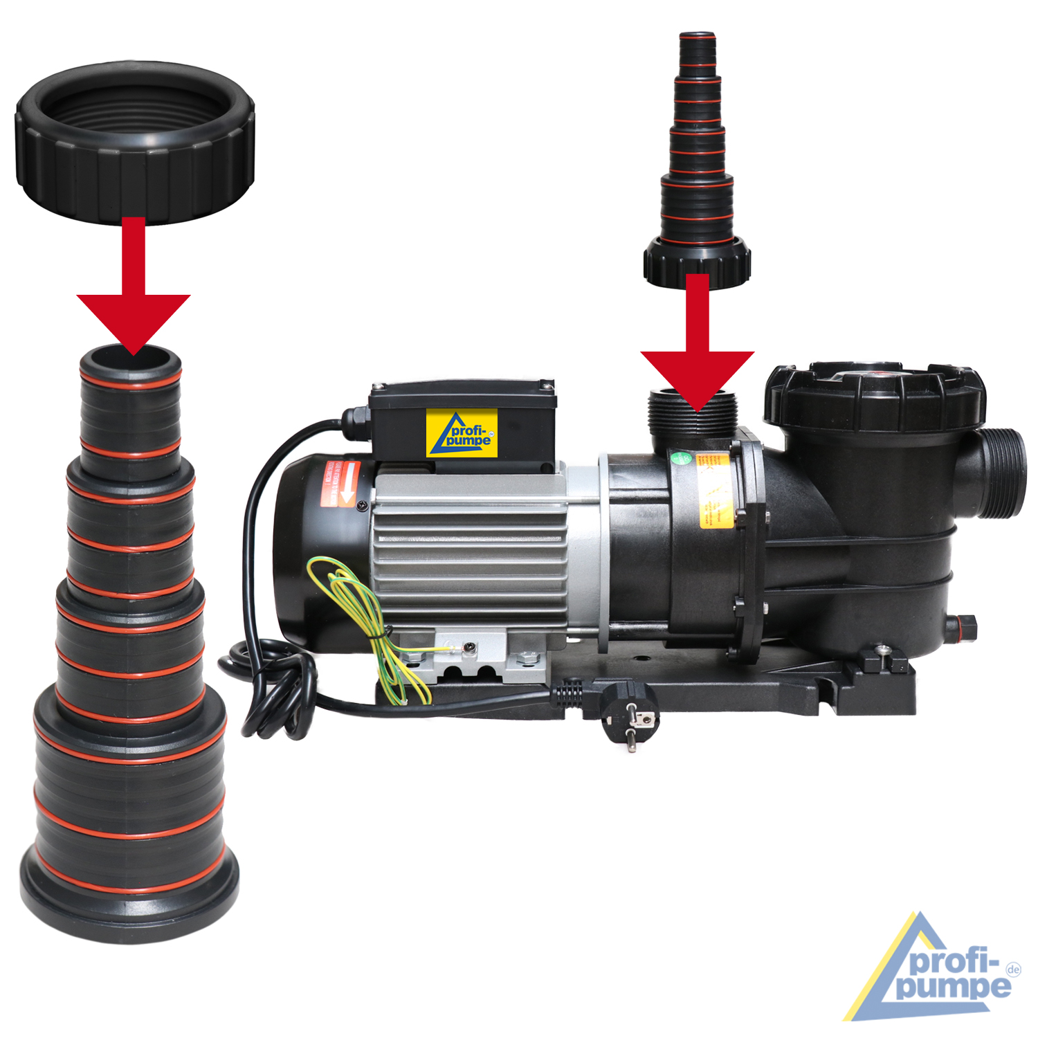 Die im Lieferumfang enthaltenen Stufenschlauchtüllen erlauben die Verwendung unserer POOL-STAR-Poolpumpen unter unterschiedlichsten Einbausituationen.