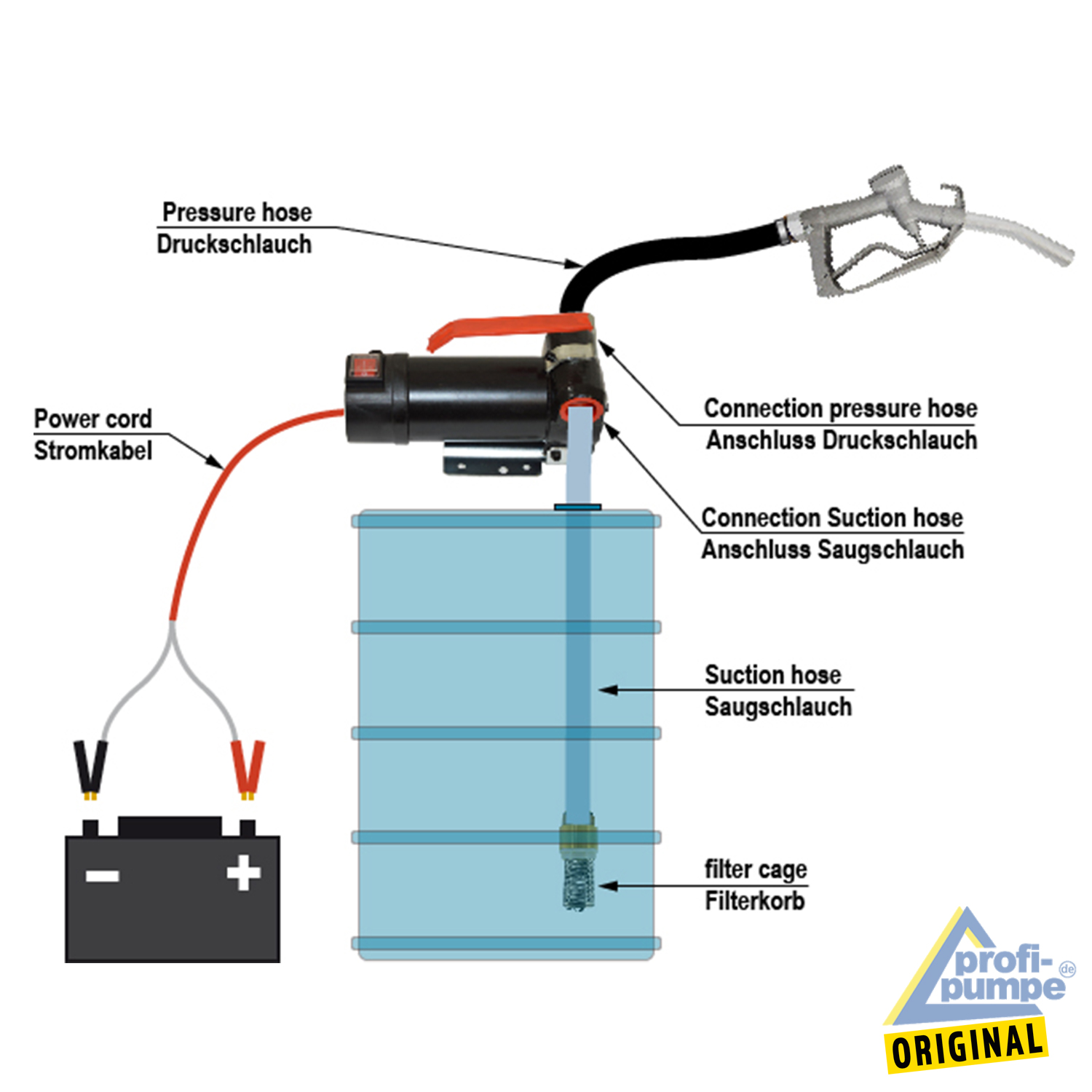 Info: Alle Pumpen sind EINZELSTÜCK-geprüft auf Ihre Funktion. Daher können Reste der Prüfflüssigkeit in der Pumpe / Verpackung vorhanden sein. Die Diesel-Pumpe und die Saugleitung sind bei der Inbetriebnahme blasenfrei mit Diesel zu befüllen. Bei Verwendung eines Rückschlagventils (in der Zubehör-Auswahl bestellbar) muss dieses unbedingt am Ende der Saugleitung montiert und dicht sein.