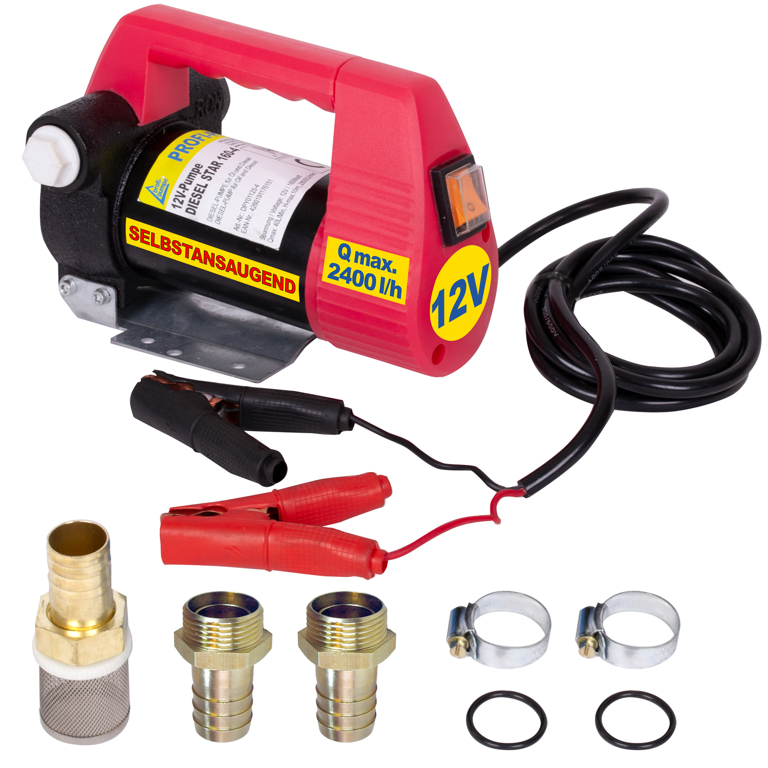 Selbstansaugende 12-Volt-Dieselpumpe mit 2 Stk Tüllen, 2 Stk Schellen und Vorfilter