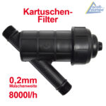 Der Kartuschenfilter wird je nach Anwendungsfall vor dem Abnehmer (z.B. Waschmaschine) oder vor der Pumpe (bei Kreiselpumpen) eingebaut. Mit einer sehr feinen Maschenweite von nur 0,2mm werden selbst kleinste Partikel aus dem Wasser gefiltert. Durch das robuste, schwarze (und somit lichtundurchlässige) Gehäuse wird die Keimbildung auf der Siebfläche verhindert.
