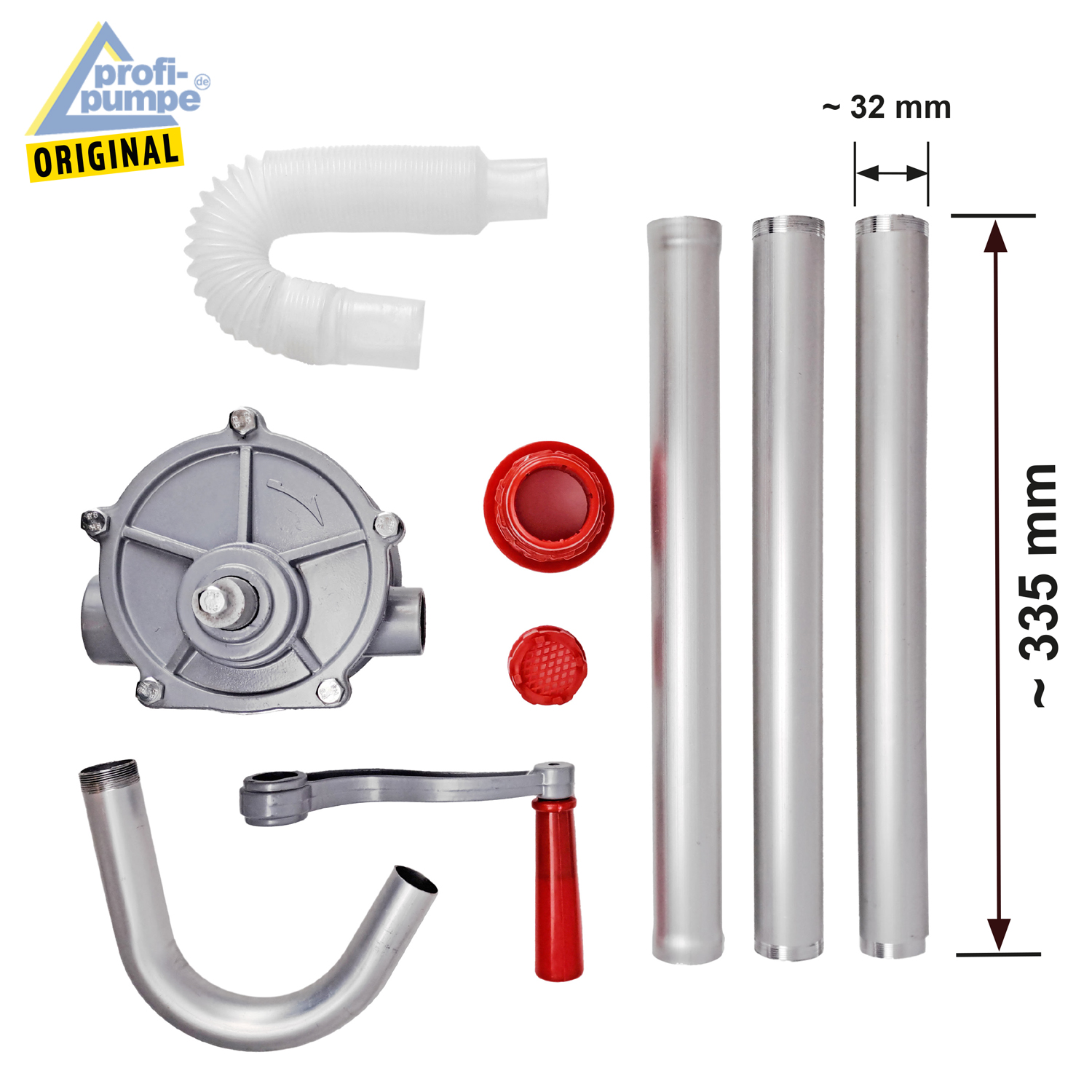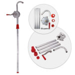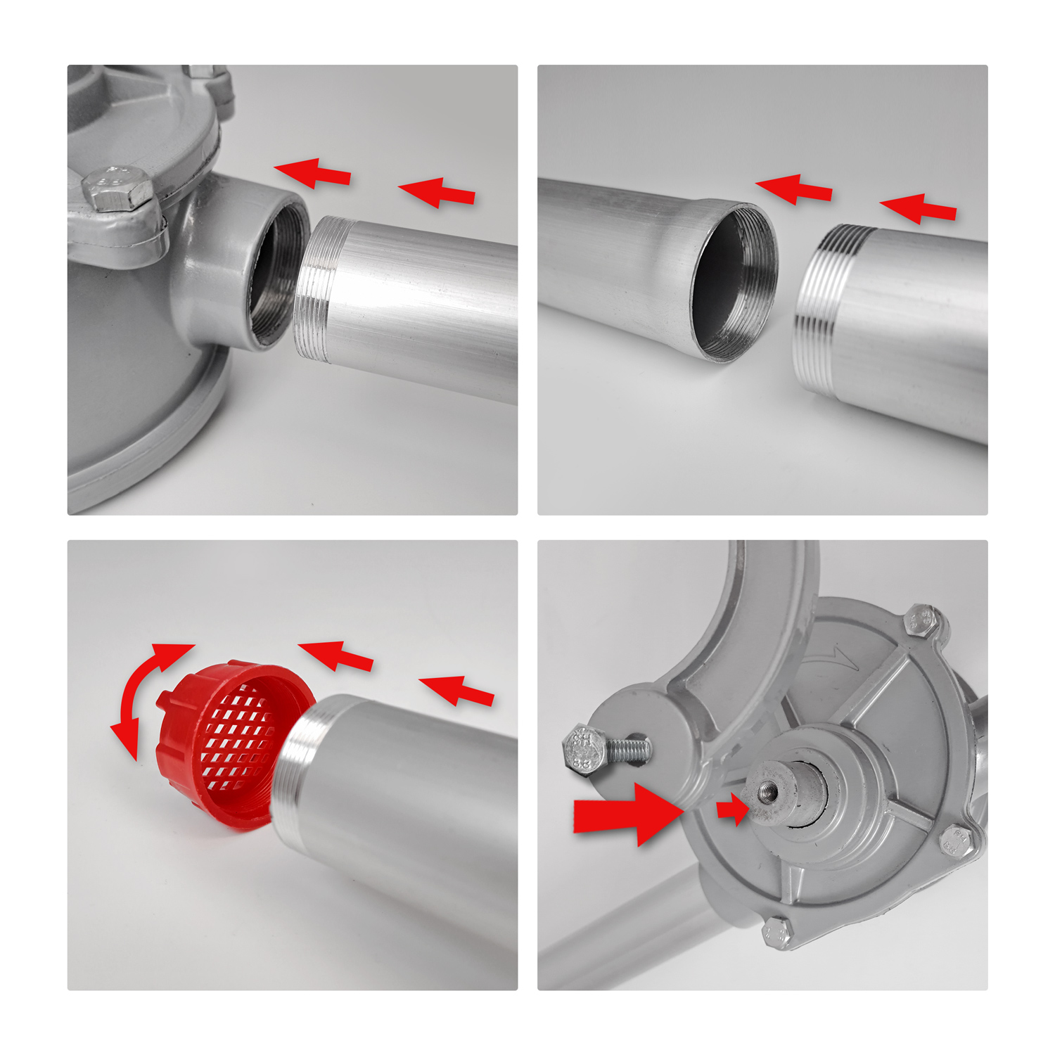 Sie hat drei zusammensteckbare Ansaugrohre und ein gebogenes Abflussrohr. Die klassische zuverlässige Pumpe mit Handkurbel, die sich ohne Vorkenntnisse einfach zusammenbauen läßt. Außerdem besitzt sie einen mitgelieferten Filter gegen Verschmutzung, der am unteren Ende des Ansaugrohrs angebracht wird sowie ein widerstandsfähiges Pumpengehäuse.