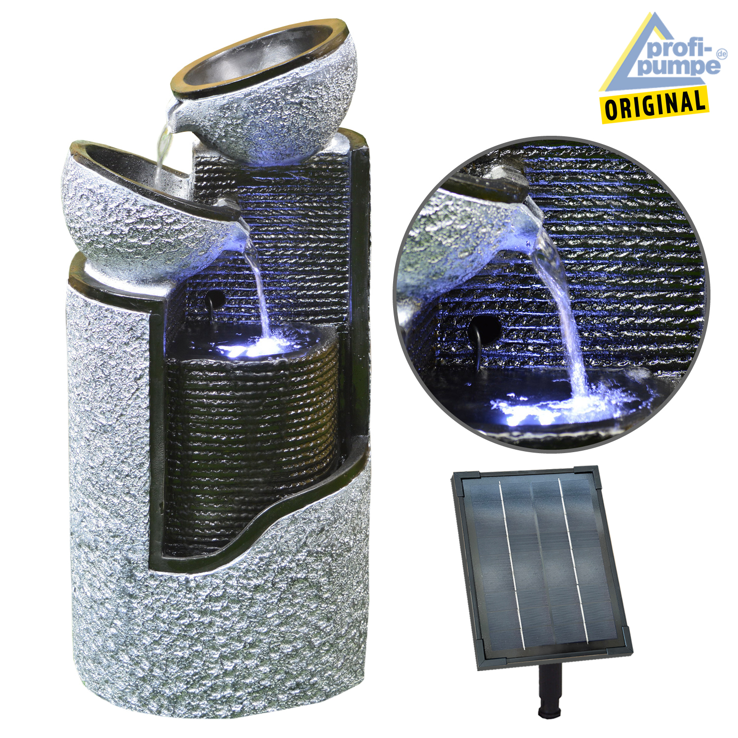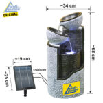 Solar – Brunnen Wasserspiel “GRANIT-SÄULE & SCHALEN-3” mit Li-Ion-Akku & LED-Licht (Neu)