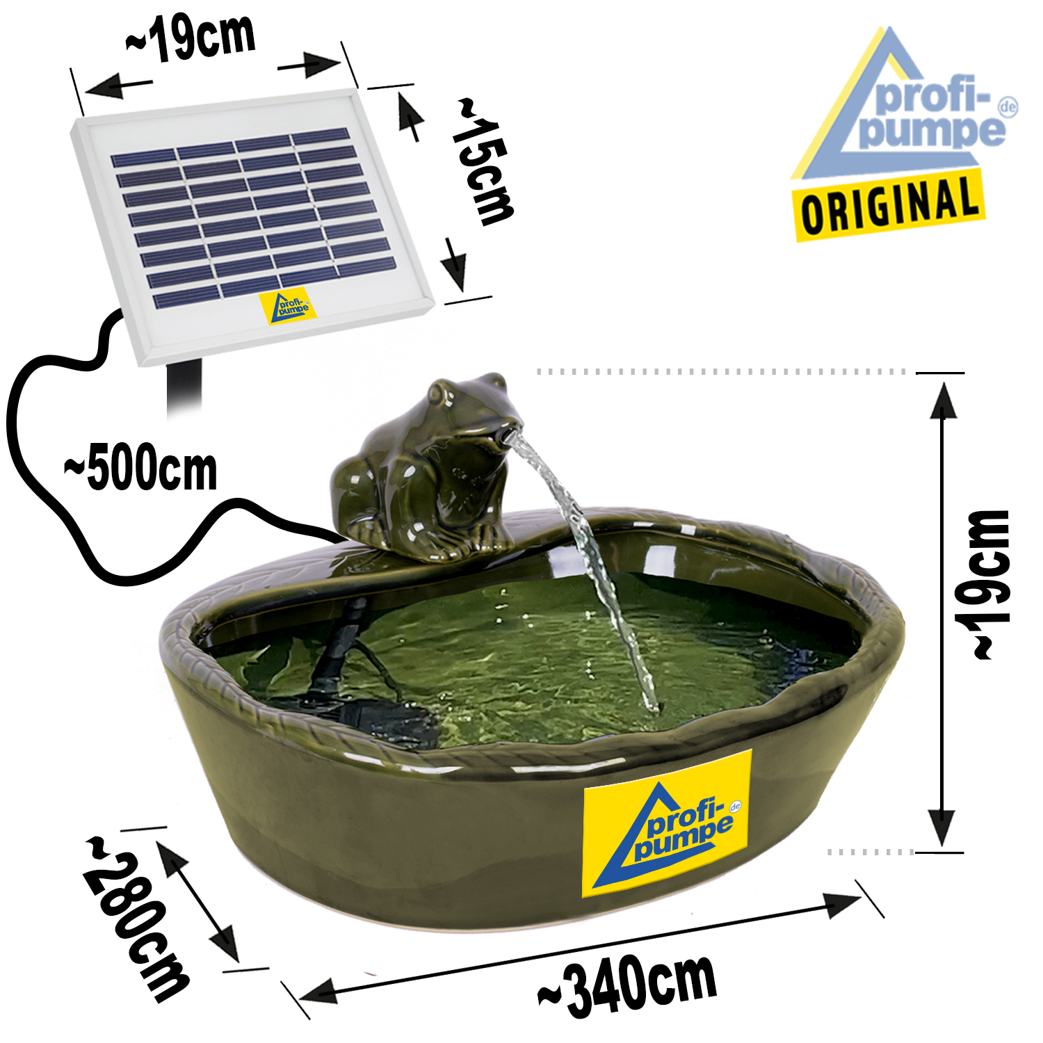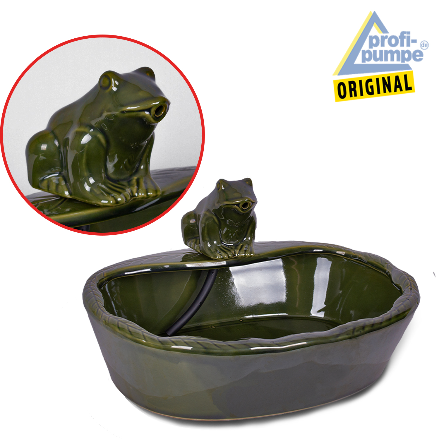 Der Solarbrunnen FROSCHPARADIES besticht durch die glänzende Keramik-Optik in natürlichem tannengrün und den zufrieden wirkenden Frosch am Beckenrand des Froschparadieses. Die solarbetriebene Pumpe fördert das Wasser aus dem Mund des Frosches in das ca. 35x27cm kleine Becken. Dieses Solar-Wasserspiel sieht nicht nur gut aus, es klingt auch schön, passt in den kleinsten Garten und sorgt für ein angenehmes Mikroklima an heißen Sommertagen.