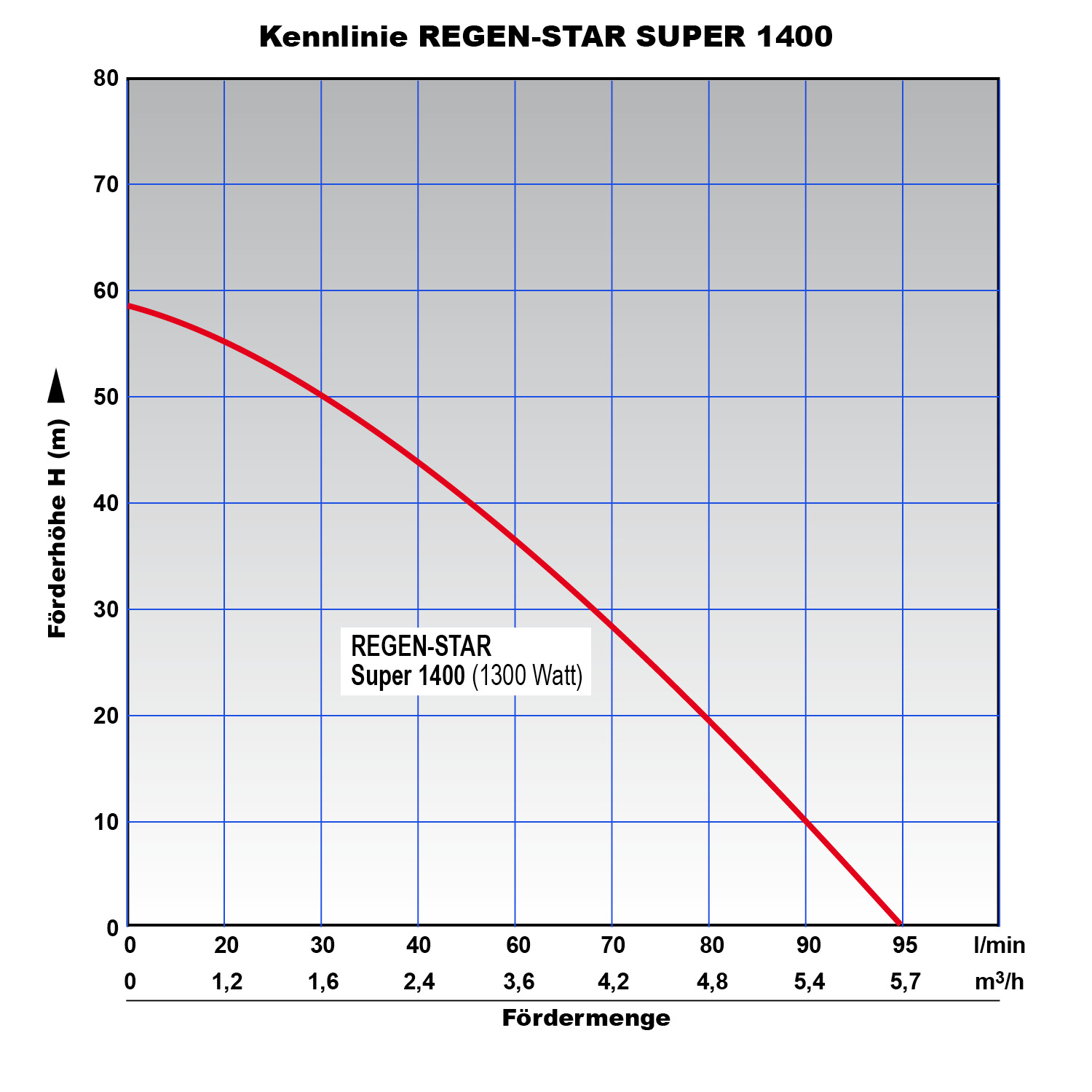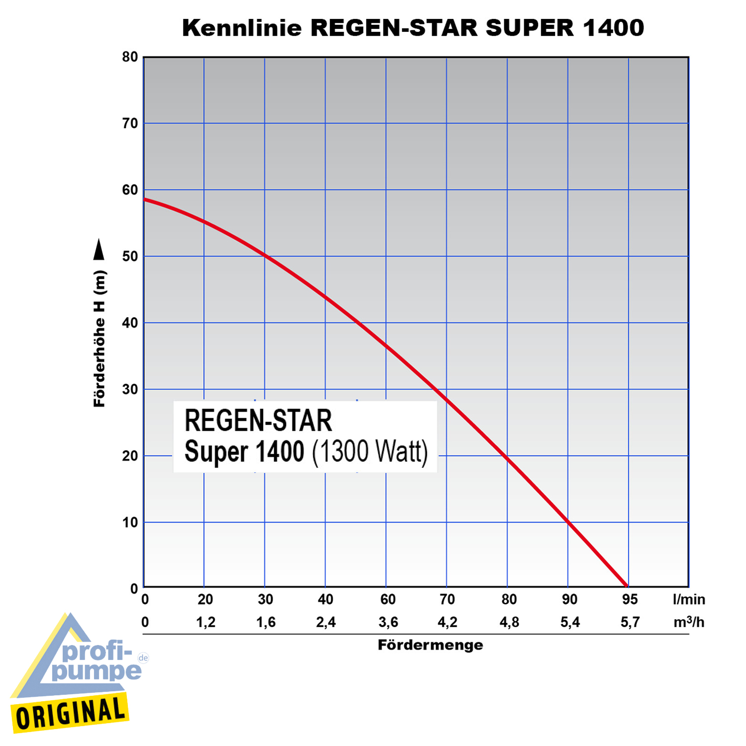 Die hochwertige mehrstufige Tauchdruckpumpe REGEN-STAR-SUPER 1400 mit geschlossenen Radiallaufrädern ist für die Förderung von sauberem Wasser mit einer max. Temperatur von 35°C bestimmt. Die Tauchpumpe fördert das Wasser mit einem Druck von 5,8 bar (üblicher Leitungsdruck) an die Abnahmestellen im Haus oder Garten. Sie kann sowohl waagrecht als auch senkrecht betrieben werden. Sie zeichnet sich durch ausgesprochene Laufruhe und geräuscharmen Betrieb aus. Grundsätzlich ist diese Pumpe ausschließlich für Klarwasser mit einem Sandgehalt von max. 60 gr/cbm einzusetzen. Zu beachten ist jedoch: Je höher der Sandanteil, umso größer ist die Pumpenabnutzung und umso mehr Betriebsstörungen jeglicher Art können auftreten.