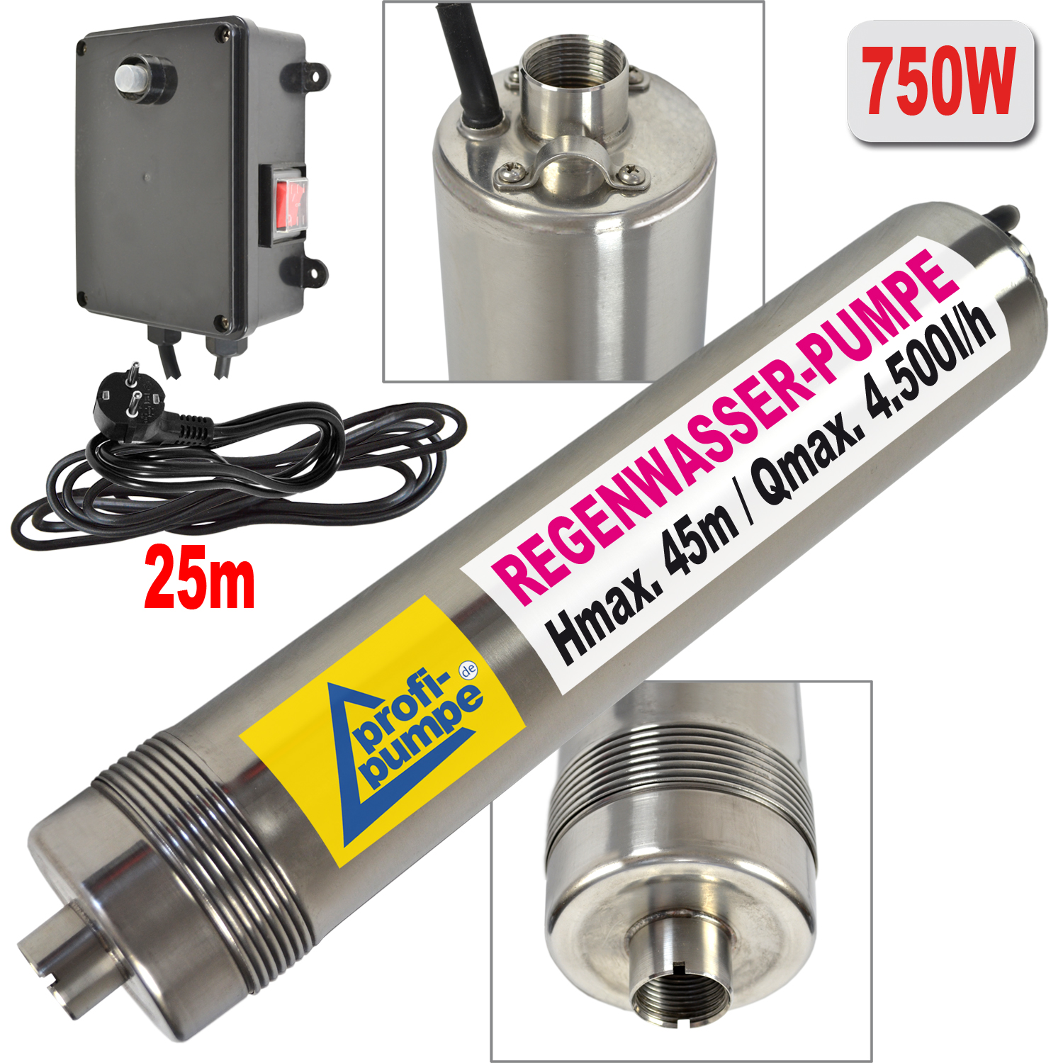 Robuste, stabile Tauchpumpe aus rostfreiem Edelstahl für den vertikalen und horizontalen Betrieb. Die Tauchpumpe Regen-Star-SUPER 750 mit Zubehörauswahl ist bestens für den Einsatz in großen Wasserspeichern geeignet. Durch den horizontalen Betrieb kann, im Gegensatz zu vertikalen Pumpen, wesentlich mehr Wasser aus dem Wasserspeicher entnommen werden. Dadurch erhöht sich das Nutzvolumen des Wasserbehälters. Die Tauchpumpe Regen-Star-SUPER 750 mit Zubehörauswahl fördert das Wasser mit hohen Druck weiter an die Abnahmestelle im Haus oder Garten.