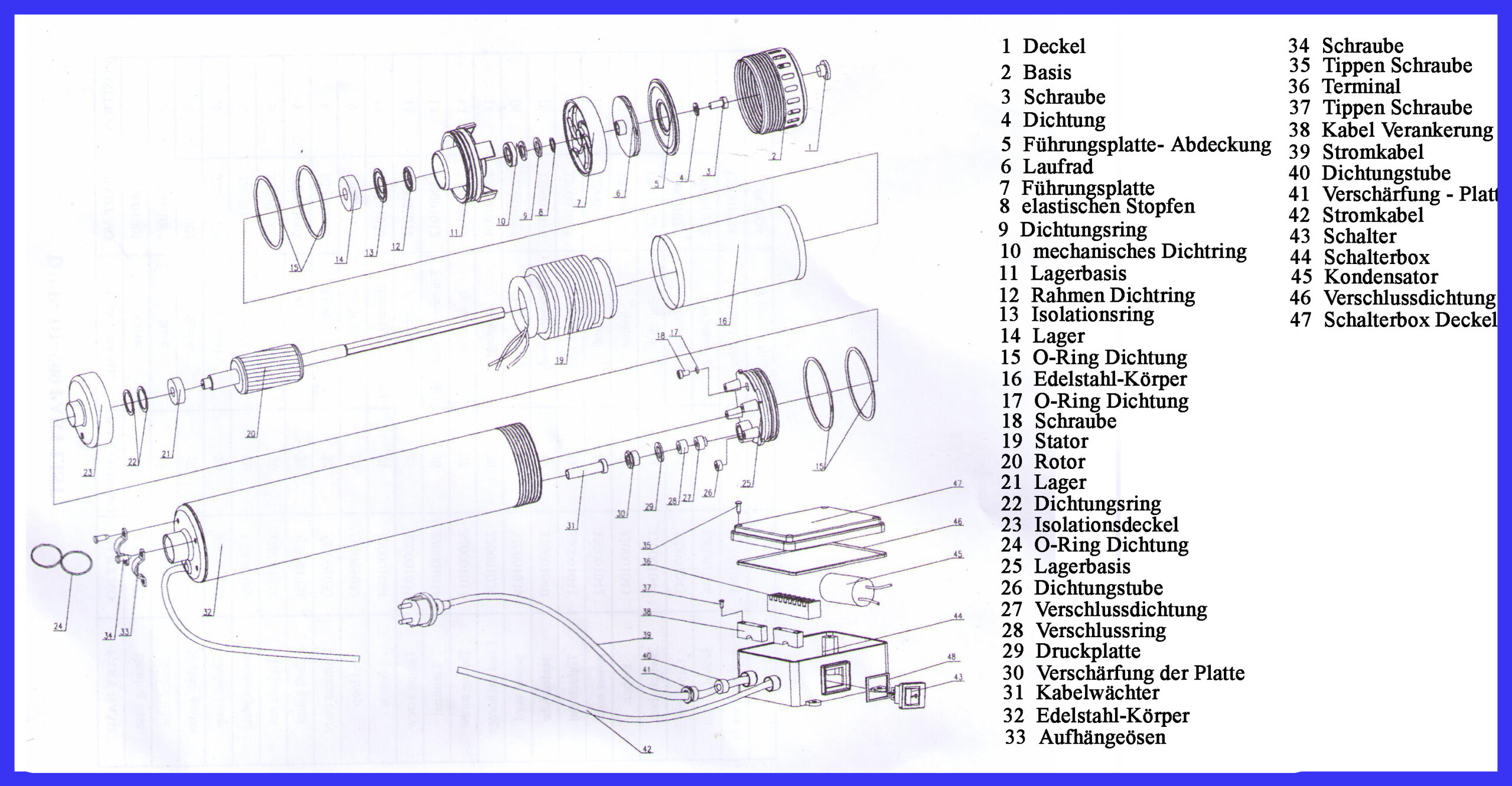 - leicht zugänglicher Kondensator in der Anschluss-Box (immer ein Vorteil, da dies i.d.R. das Bauteil ist, das bei Tauchdruckpumpen einem gewissen Verschleiß unterliegt)