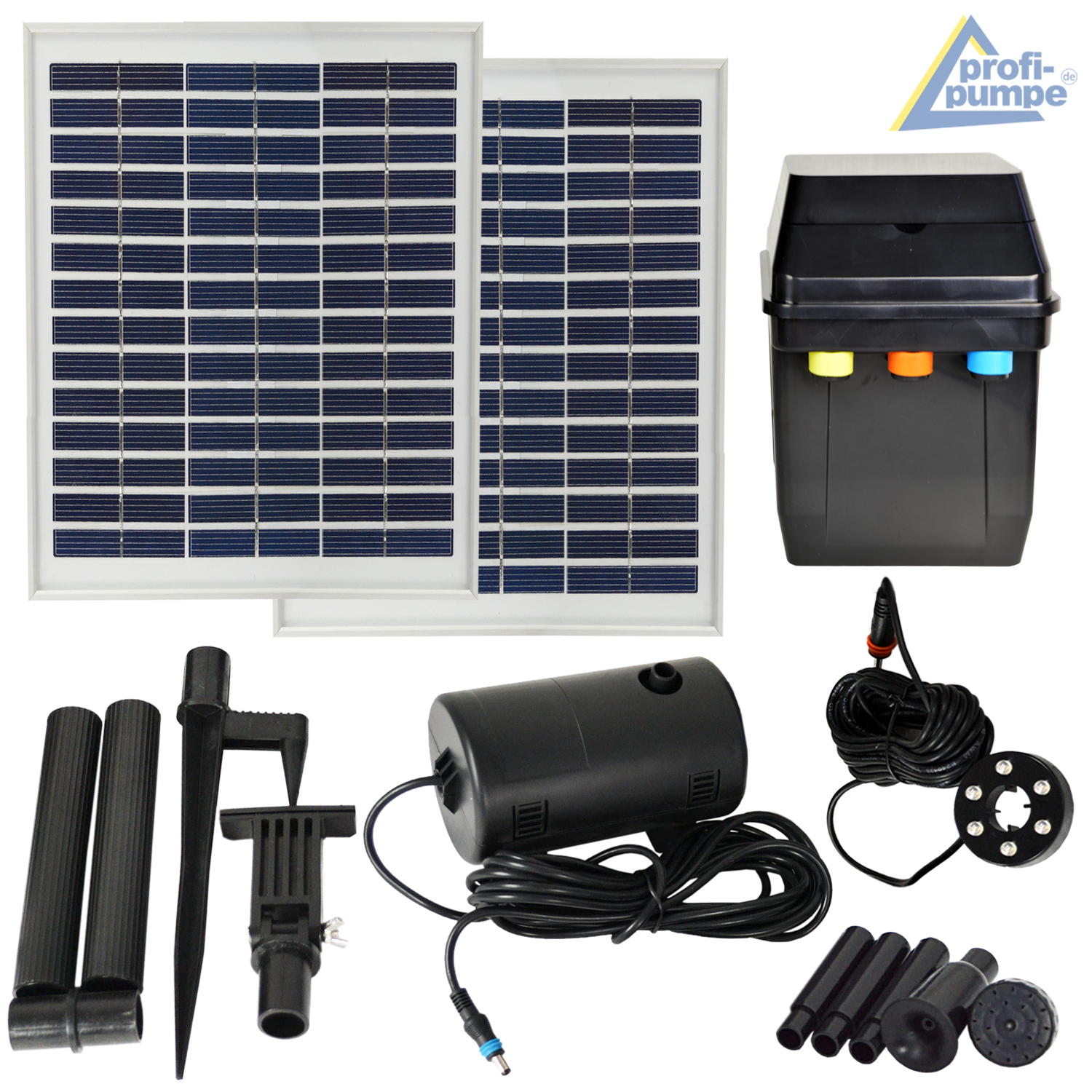 Leistung max. 2 x 10 Watt / Max. Förderhöhe 150cm / 2 unterschiedliche Fontänenaufsätze / Betrieb auch im Schatten