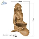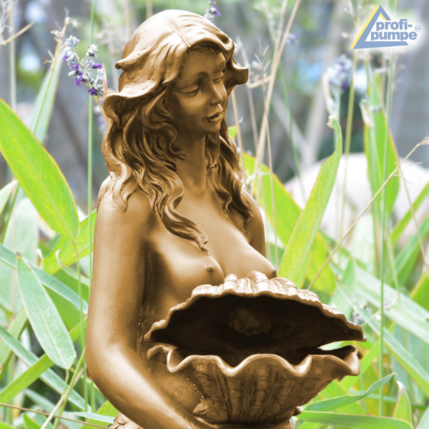 Die Meerjungfrau besticht durch Ihre Größe und Oberfläche, die den Eindruck einer Bronzefigur entstehen lässt. Die kräftige Pumpe fördert das Wasser in die Muschel, aus der es dann an mehreren Stellen wieder in das Gewässer zurück fällt. Dieses Wasserspiel sieht nicht nur gut aus, es sorgt auch für eine gute Sauerstoffversorgung in Ihrem Teich.