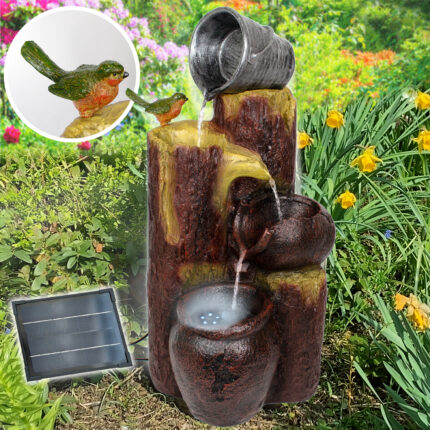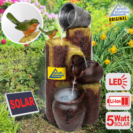 Solar – Brunnen Wasserspiel “BAUMSTUMPF & TONKRÜGE-3” mit Li-Ion-Akku & LED-Licht (Neu)