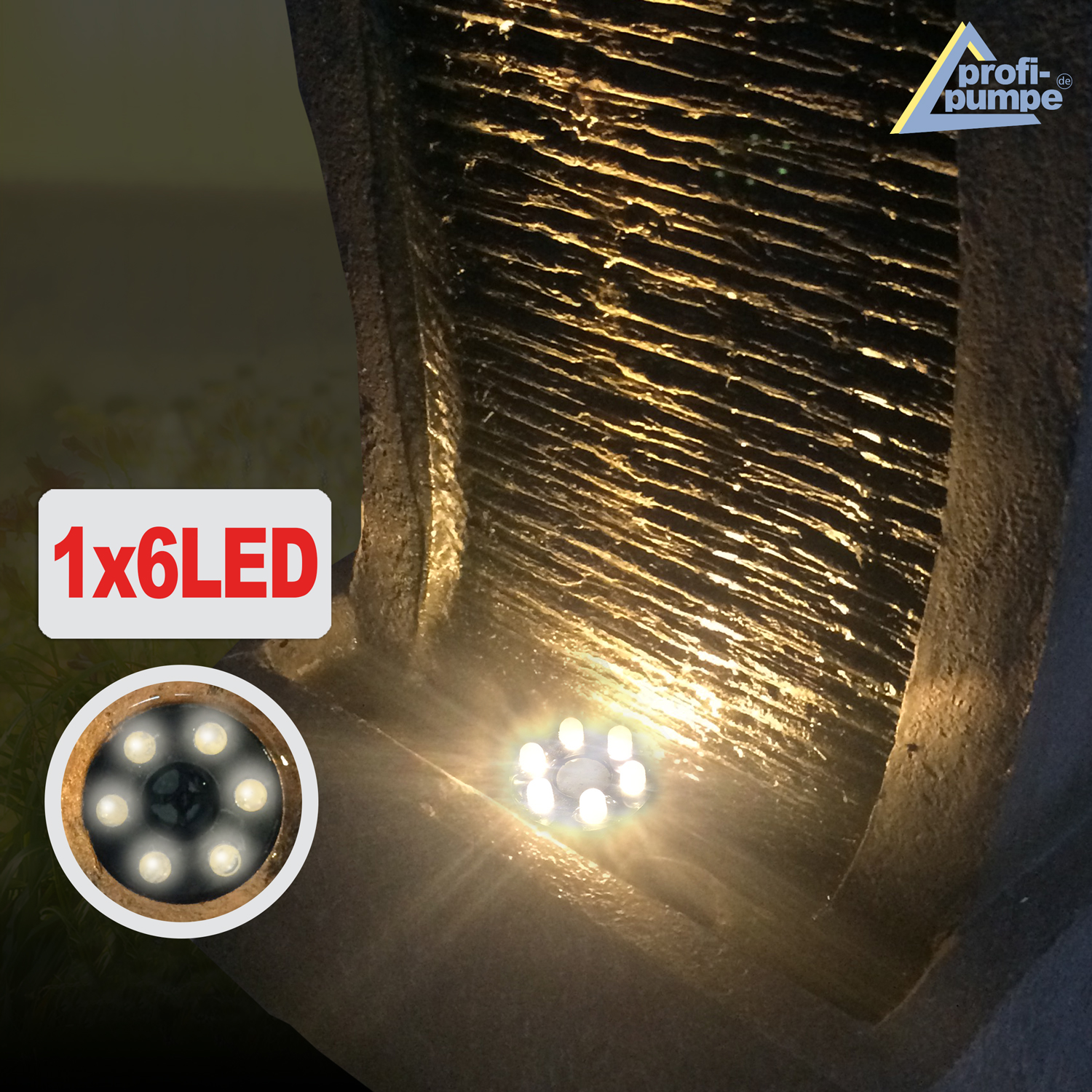 Der Garten- und Zimmerbrunnen “RHEIN-GOLD ” mit der LED-Beleuchtung ist für den Innen- und Außenbereich geeignet.