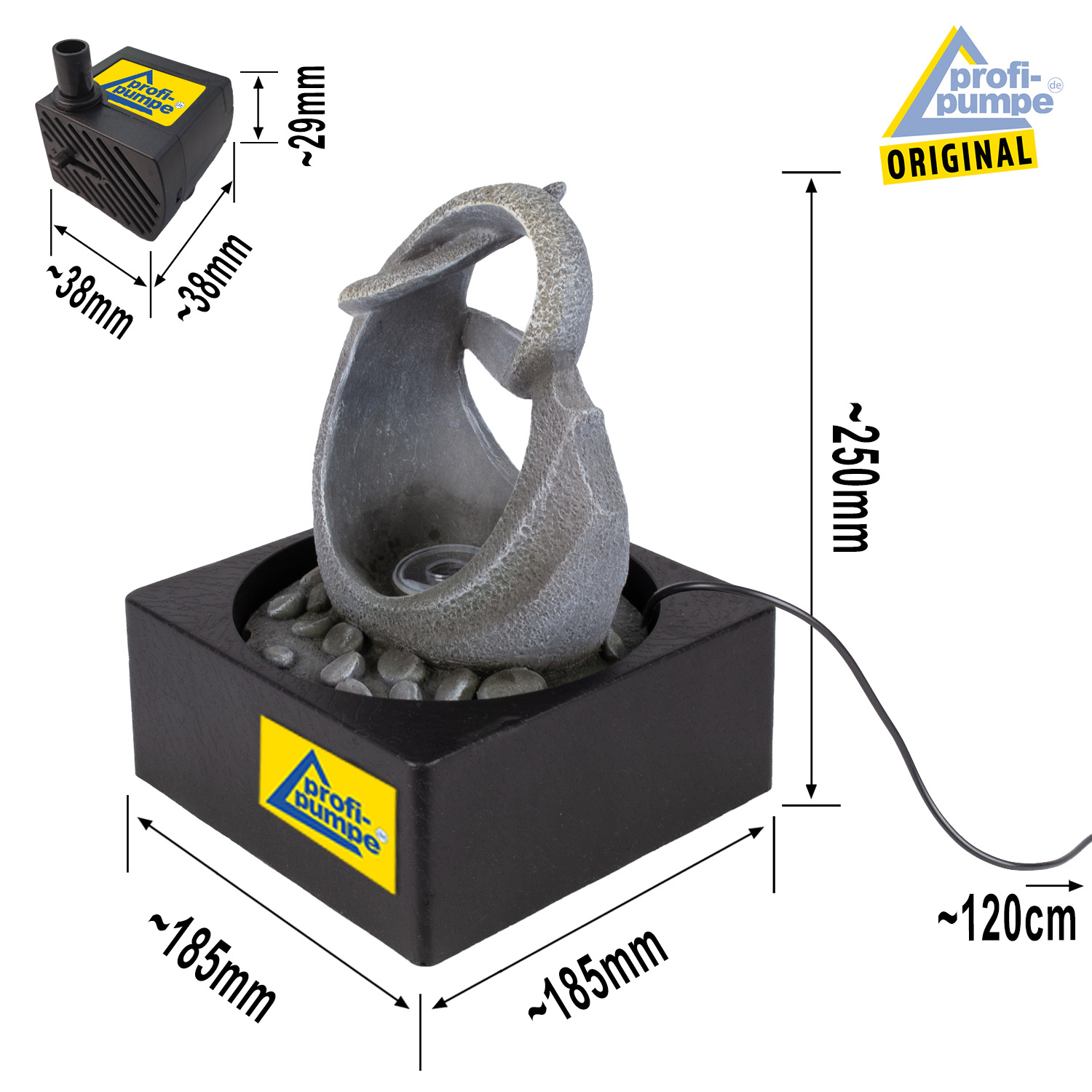Der Wasserbrunnen ist für den 230-Volt-Betrieb vorgesehen. Die Pumpe und die LEDs werden mit sicherer 12V-Niederspannung betrieben (Adapter im Lieferumfang enthalten). Alle Kabelverbindungen sind verpolungssicher, wasserdicht und absolut funktionssicher. Dank praktischer Steckverbindungen sind alle Komponenten jederzeit austauschbar. So können Sie den Wasserbrunnen mit der effektvollen LED-Beleuchtung und das fließende Wasser jahrelang genießen!