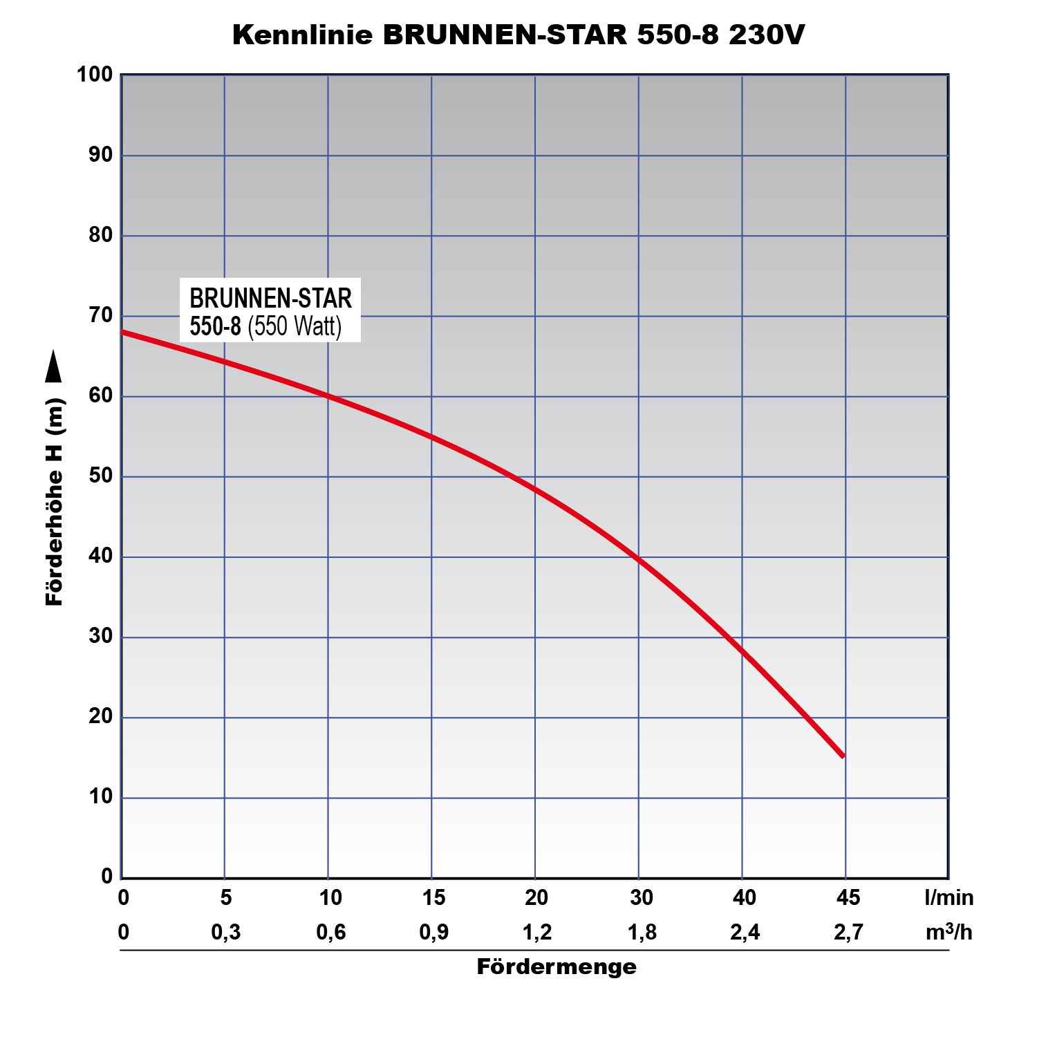 Trotz der geringen Leistungsaufnahme schafft die bedingt sandverträgliche Tiefbrunnenpumpe eine Fördermenge von bis zu 3720l/h. Der maximale Druck liegt bei 6,8 bar, die maximale Förderhöhe bei 68m.