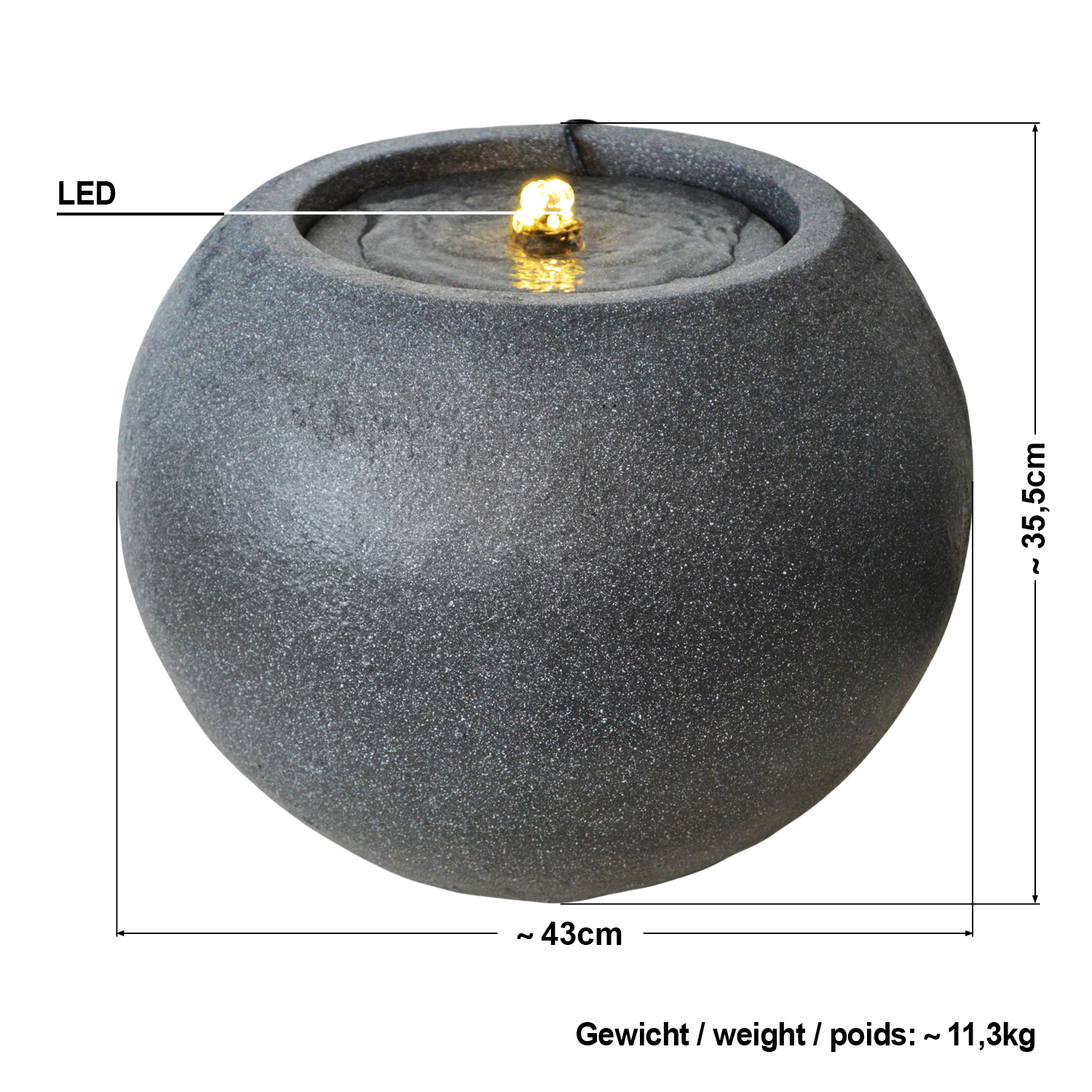 Der Gartenbrunnen ist sowohl bei Tag als auch bei Nacht der perfekte Hingucker. Die mitgelieferte LED-Beleuchtung sorgt für die perfekte Illumination. Die LED-Lichter des austauschbaren LED-Rings erstrahlen in einem warmen Weiß.