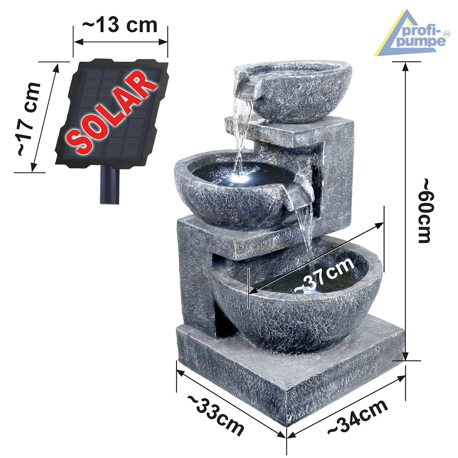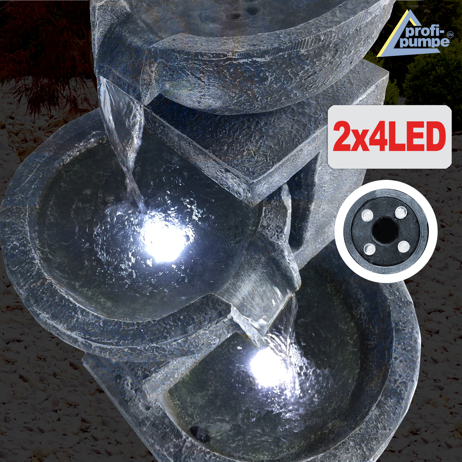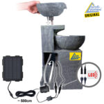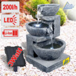 Solar – Gartenbrunnen & Wasserspiel “GRANITSCHALEN-KASKADE-3” mit LED-Licht und Li-Ion-Akku
